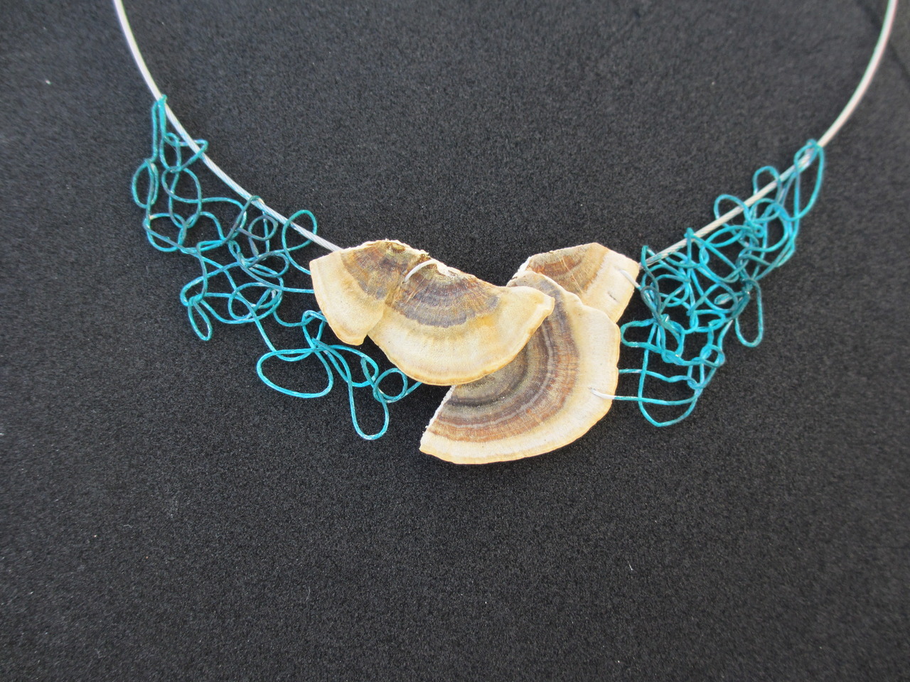 Een collier waarin enkele boomzwammen een hoofdrol spelen. Daarom een 'breisel'van blauw/groen draad.