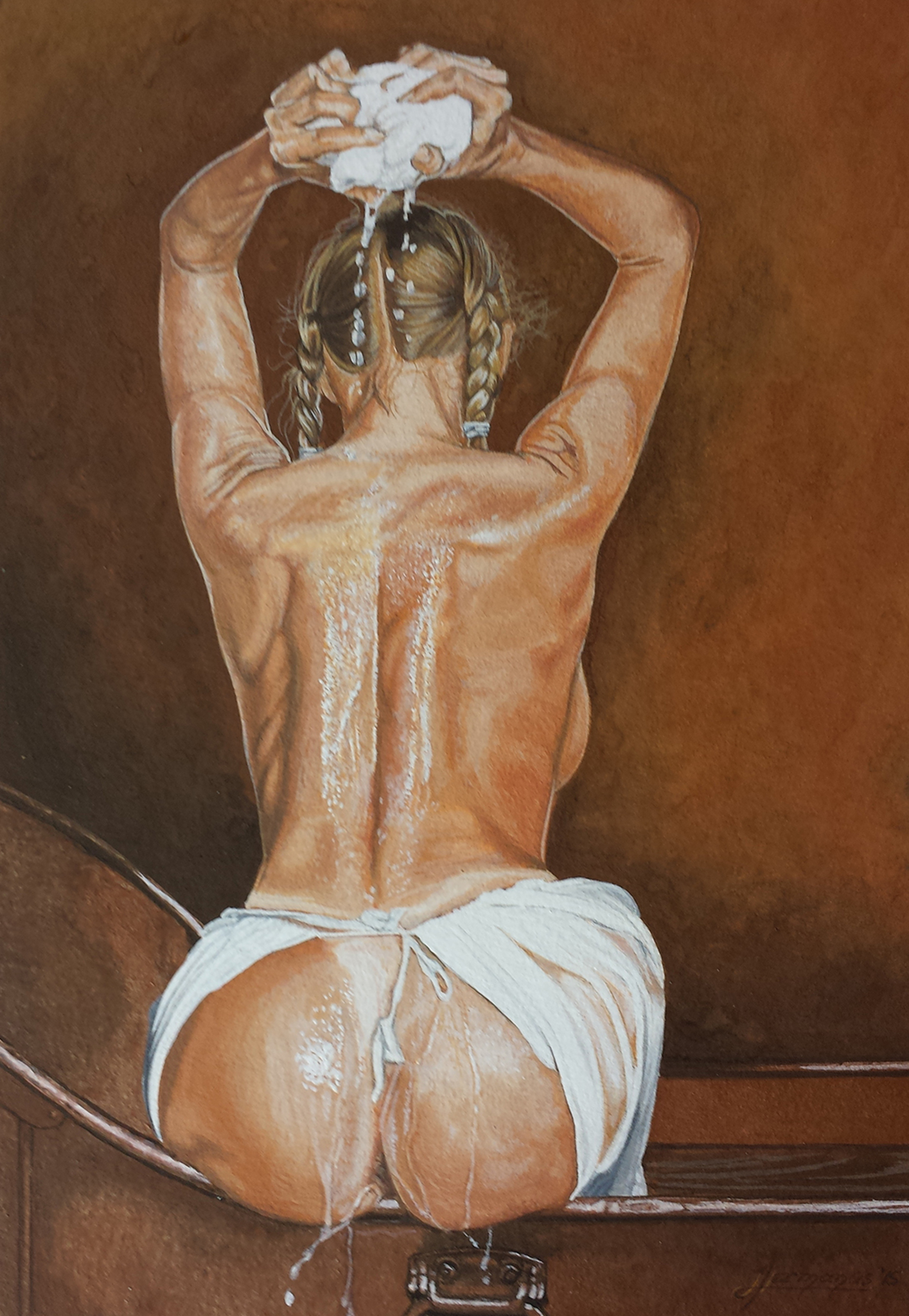 Danni Ashe. Badend in een koperen badkuip.
