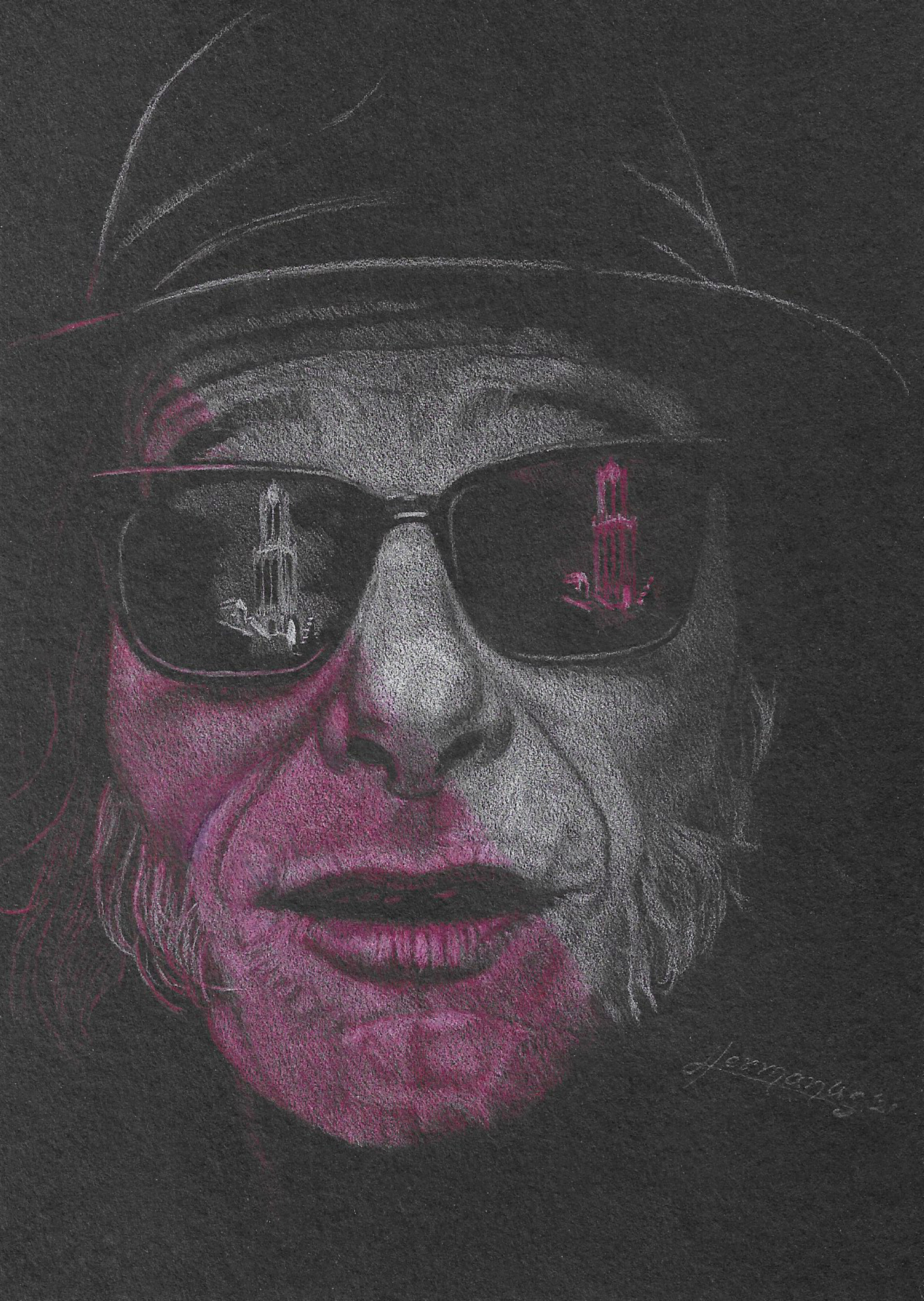 Zanger Jan van Piekeren van Van Piekeren. Getekend voor de serie Bijzondere Utrechters in De Nuk, op zwart papier met kleurpotloden.