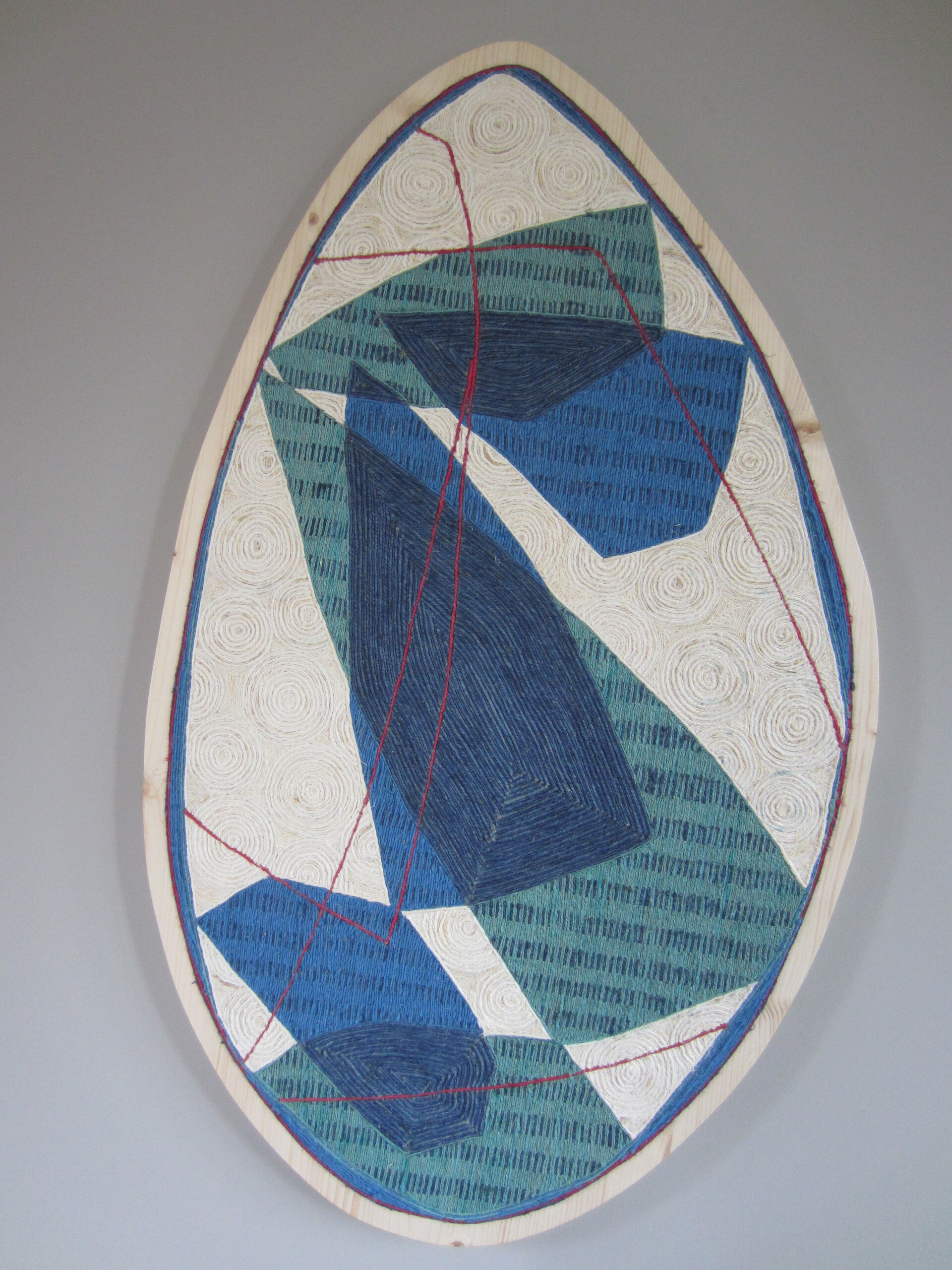 Vlastouw op hout. De ondergrond is in een vrije vorm gezaagd en bewerkt met vlastouw dat met de hand op kleur geverfd is. Het onderwerp is regen op stapstenen. Je ziet hoe de regen valt en hoe druppels kringen vormen in de plassen naast de stapstenen.