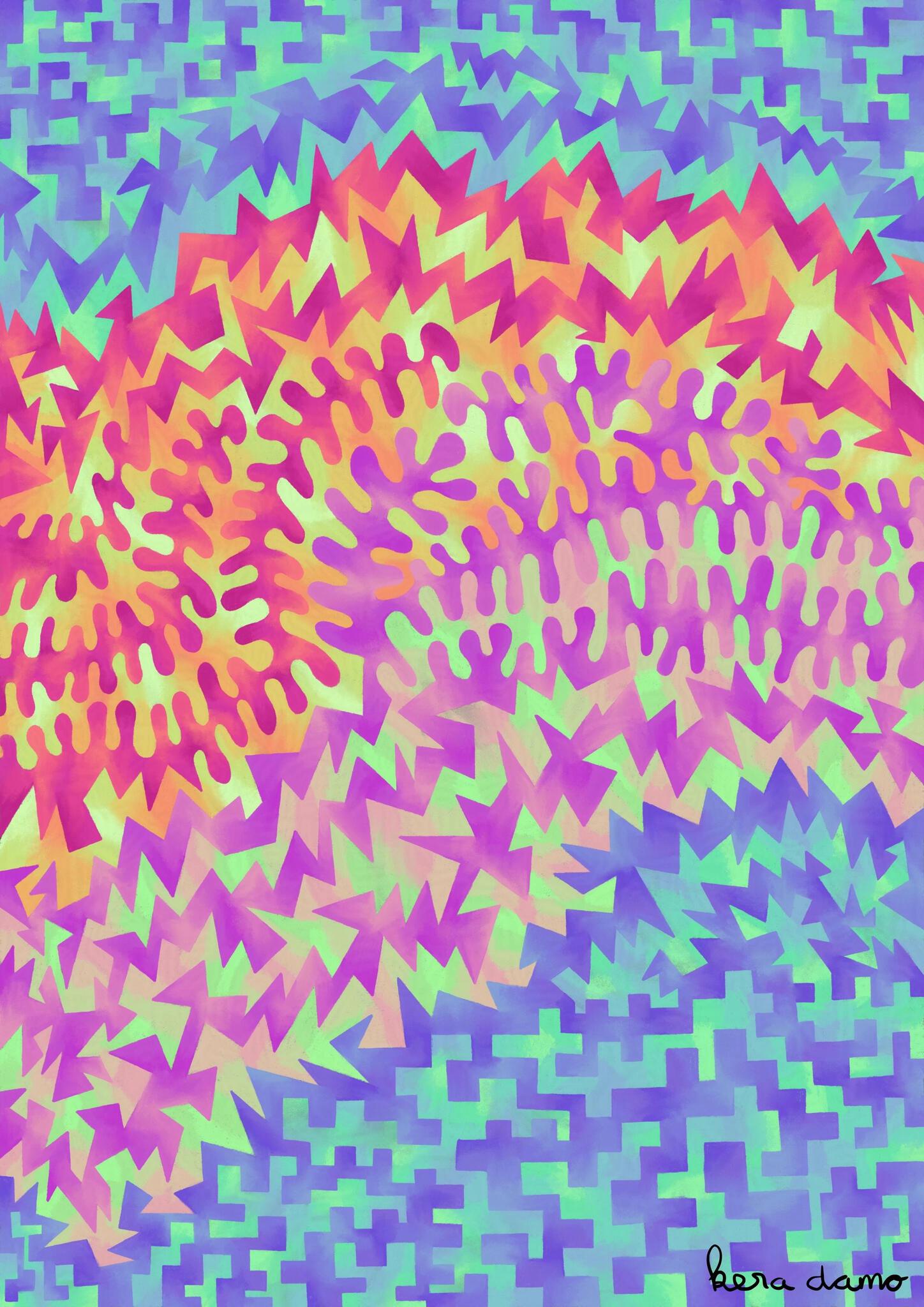 Dit digitale kunstwerk, onderdeel van de serie De Flow is zowel beschikbaar in kleur als in zwart/wit. Vaak zit er een significante verschuiving in betekenis door wel of geen kleur te gebruiken. Regelmatig maak ik meerdere versies om te kijken naar de effecten er van. Sinds 2019 werk ik veel met het programma Procreate. Als we kijken naar het geven en ontvangen vanuit het hart, dan zal het soms soepel vloeien, maar soms zijn er ook obstakels. De kleuren geven ook de dynamiek tussen warmte en koude aan.