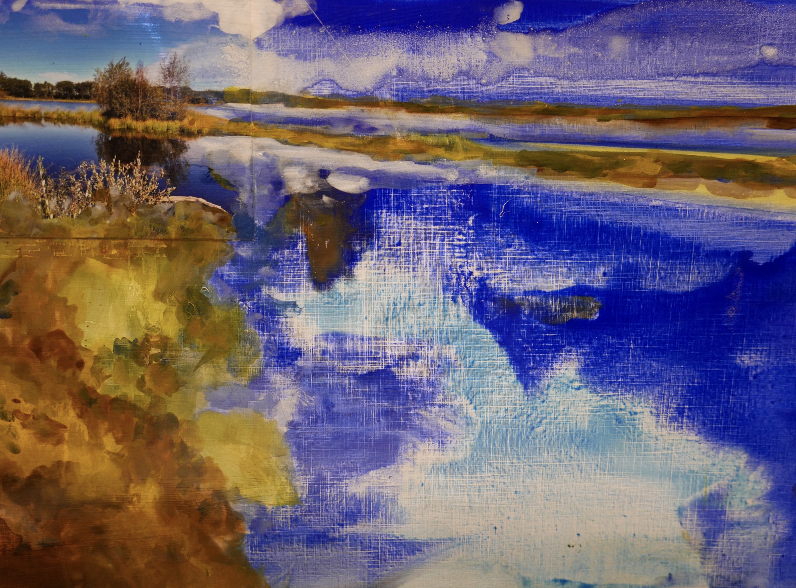 20 schilderijen met een geschilderd impressionistisch landschap geïnspireerd door een foto van de Overasseltse of Haterse vennen. De foto stamt uit september 2024. Pigment op speciaal papier 48×36 cm. Een eerbetoon aan Vincent van Gogh