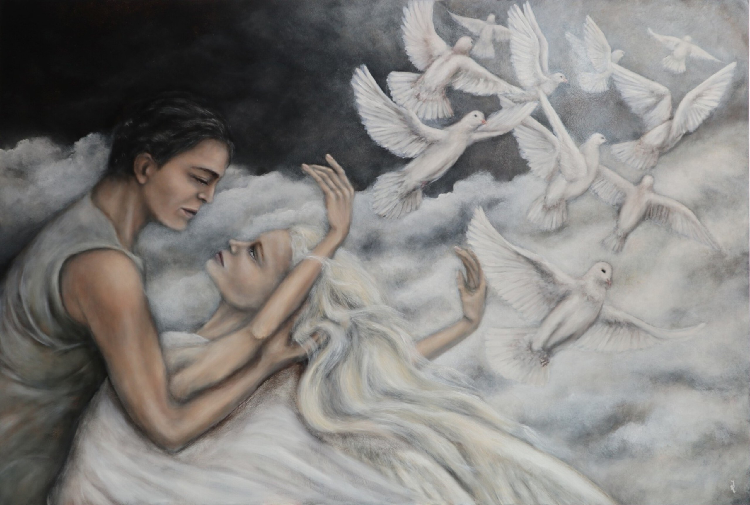 Schilderij God Mystiek Spiritueel Vrouw Man Hart Liefde Olieverf Engel Dood Afscheid Pijn Droom Vliegen Leven Oneindig Geloof Vasthouden Eindeloos Paar Verlossing