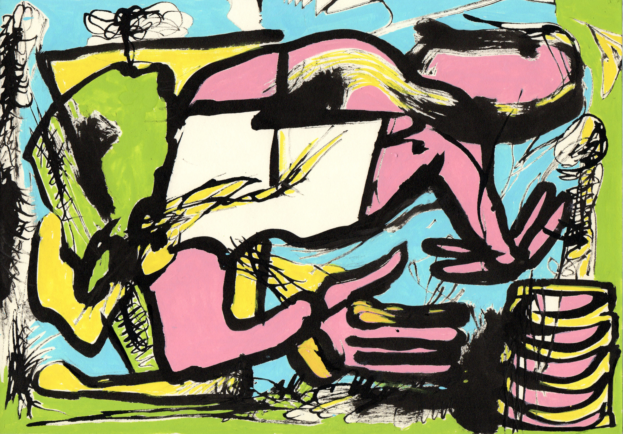 Tekening in inkt, gemaakt in 1997, (in)gekleurd met gouache of plakkaatverf in 2024-2025. De oorspronkelijke inkttekening werd hierbij zo nauwkeurig mogelijk ongewijzigd gelaten, zodat het niet om het uitwissen of 'verbeteren' van sporen van het verleden gaat maar er enkel een rooskleuringe inkleuring van is.