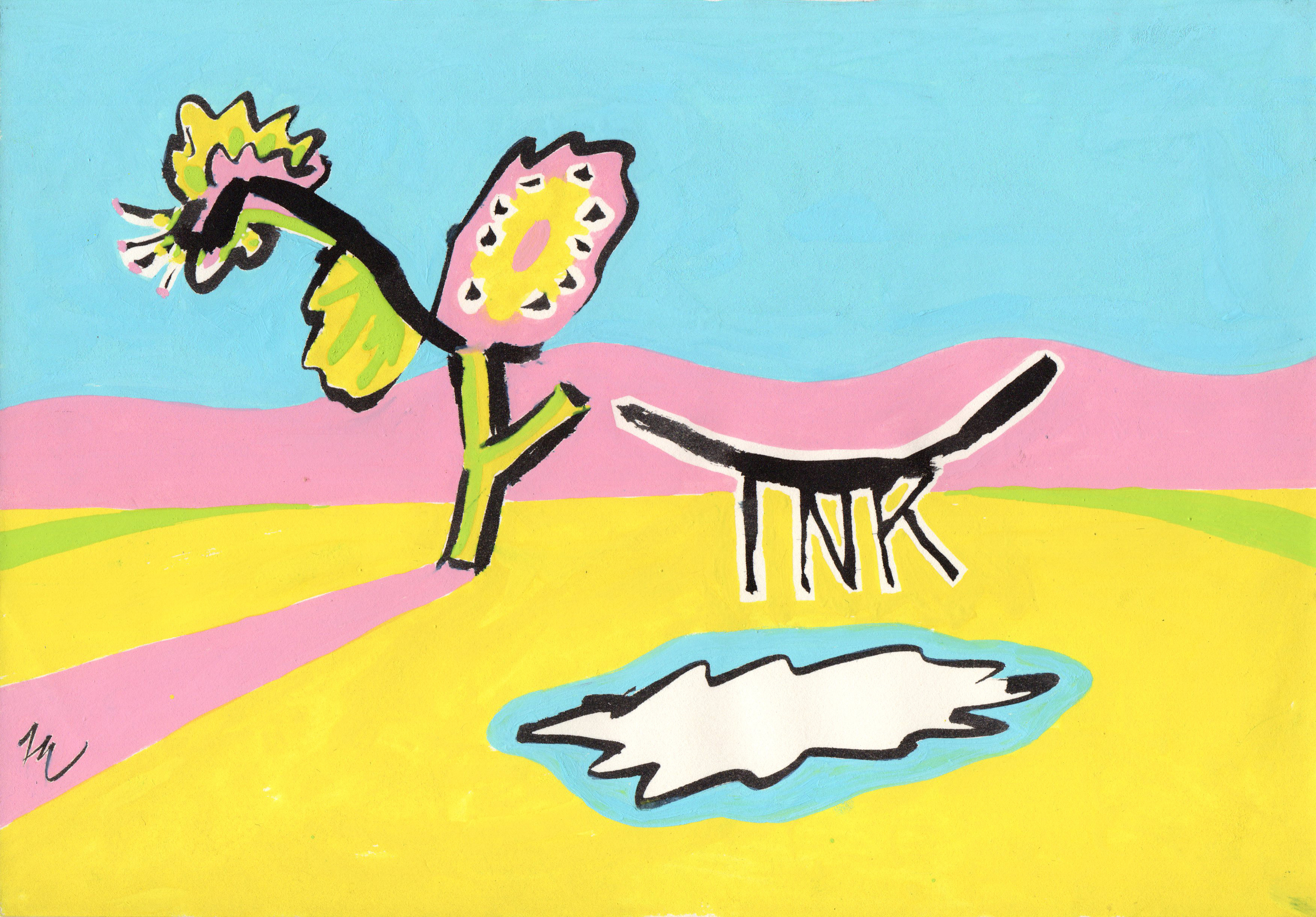 Tekening in inkt, gemaakt in 1997, (in)gekleurd met gouache of plakkaatverf in 2024-2025. De oorspronkelijke inkttekening werd hierbij zo nauwkeurig mogelijk ongewijzigd gelaten, zodat het niet om het uitwissen of 'verbeteren' van sporen van het verleden gaat maar er enkel een rooskleuringe inkleuring van is.