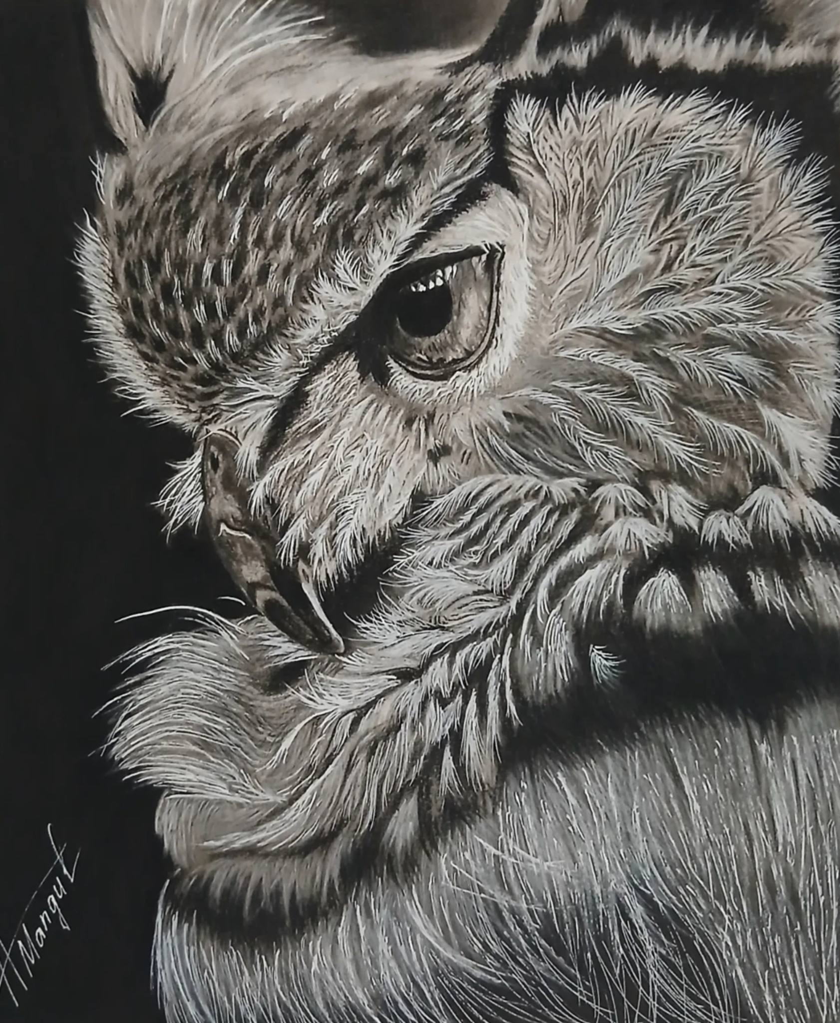 Een gedetailleerde houtskooltekening van een uil, waarbij de focus ligt op de intense blik en de zachte textuur van de veren. Dit werk symboliseert wijsheid en observatie. Met grote zorgvuldigheid getekend op A3-formaat, klaar om een unieke sfeer in uw interieur te creëren.