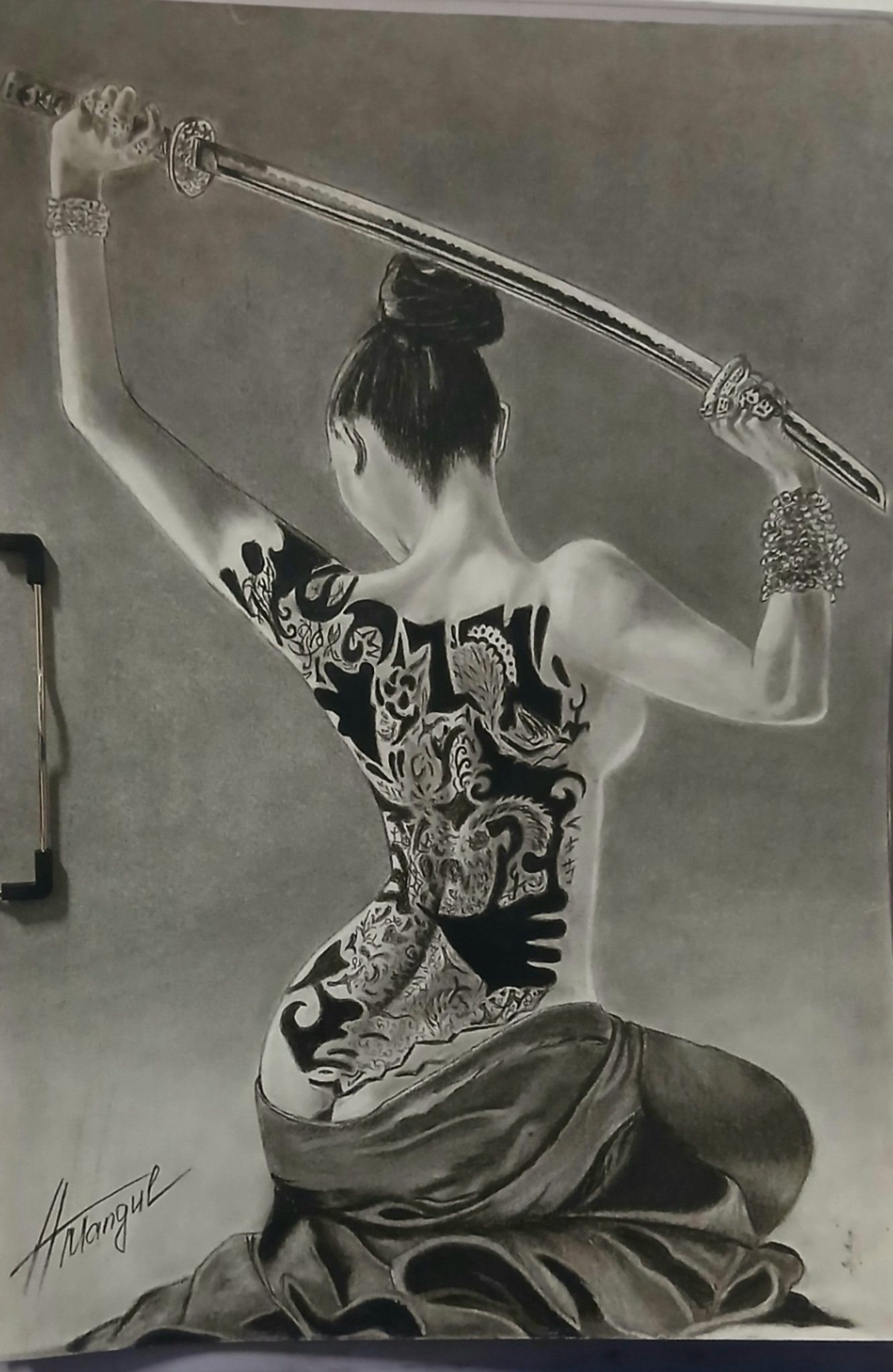 Tederheid En Kracht Vrouwelijke Rug Vrouw Met Zwaard Tatoeage Houtskool Fine Art Naakt