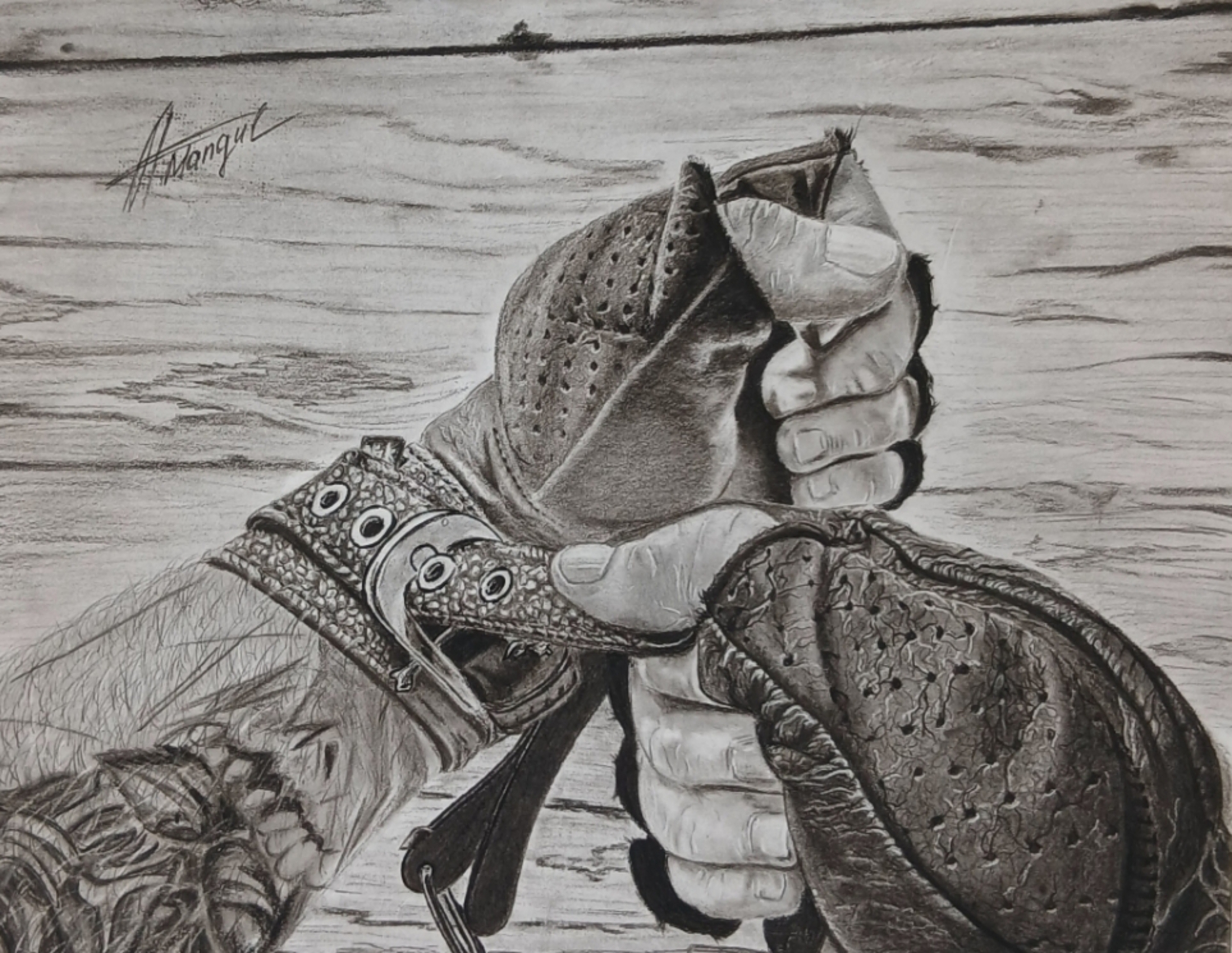 Sterke Handen Motorrijder Leer En Kracht Motorhandschoenen Ruige Houtskool Fine Art Realizme