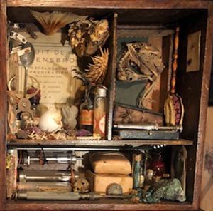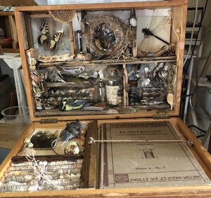 Er is schoonheid in vergankelijkheid, maar niet in het vergaan van schoonheid. Dit is het devies van mijn kunst. Een deel van mijn materialen komen uit de natuur, een ander deel is afkomstig van rommelmarkten. Ik ben veel in de natuur, waar ik verse dode vogels, insecten en plantaardige materialen verzamel. Ik prepareer ze en voorkom zo dat mooie vogels en insecten vergaan en verdwijnen. Ook krijg ik veel materialen aangeleverd door vrienden en familie. Ik maak nooit een dier dood. De huidige wereld vind ik leeg en kaal. Vandaar dat mijn kunstwerken vol zijn. Zo voel ik me hier toch een beetje thuis.