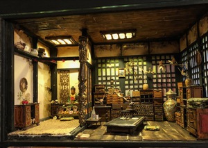 Miniatuur interieur in Japanse stijl, met boedhabeeld en altaar.