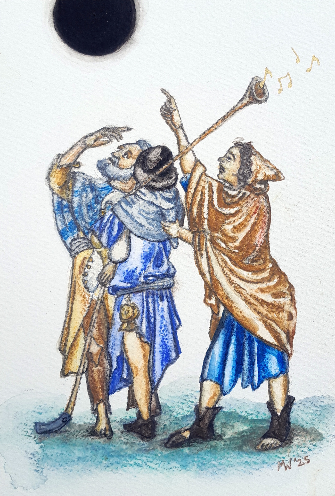 Geïnspireerd op "De Aankondiging aan de herders" van de Gebroeders van Lymborch. Maar wat kondigt zich hier aan de herders aan? Aquarelpotlood op 300 grams aquarelpapier.