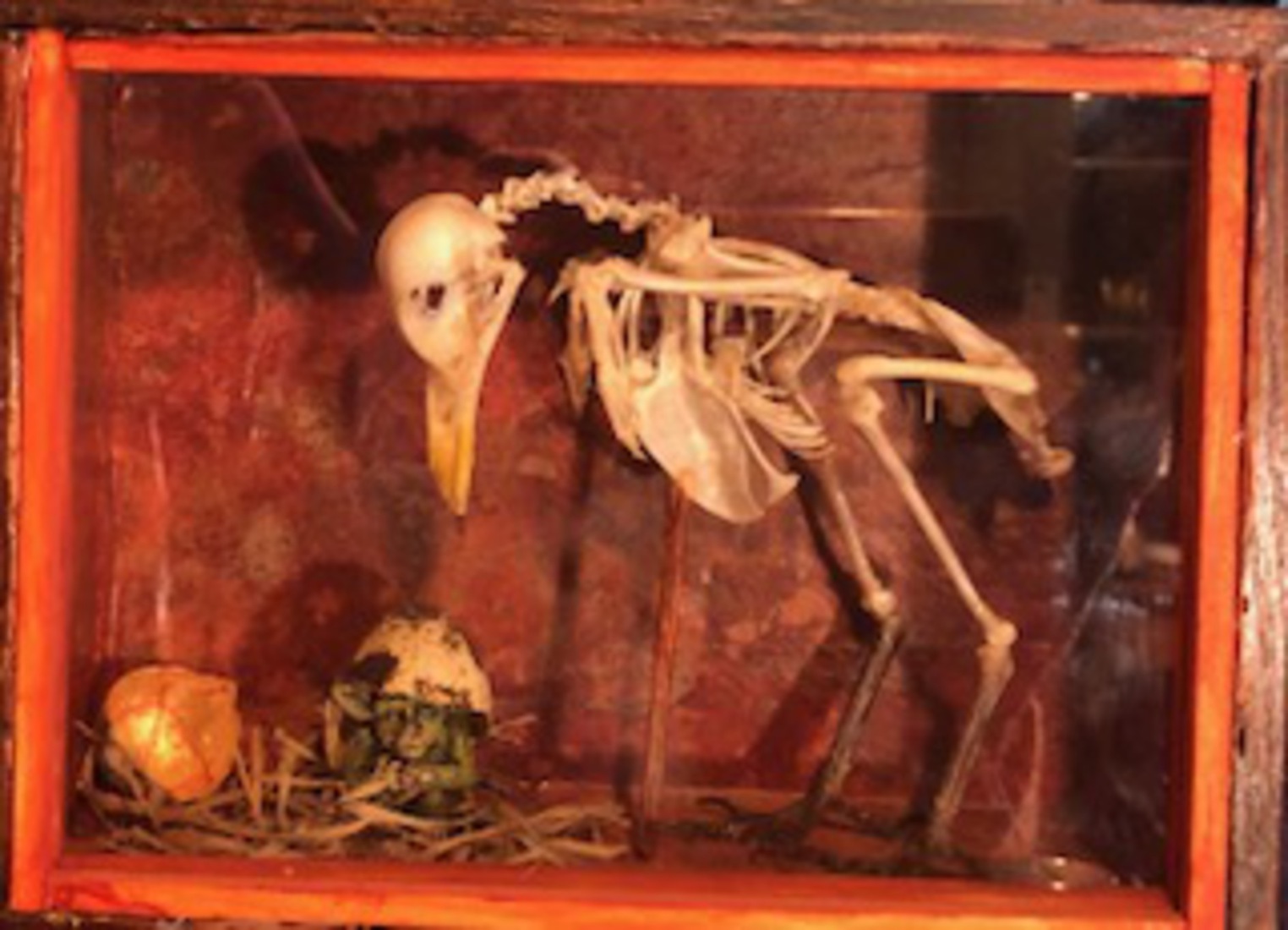 Het geraamte van een merel, gebogen over een ei met vreemde inhoud.