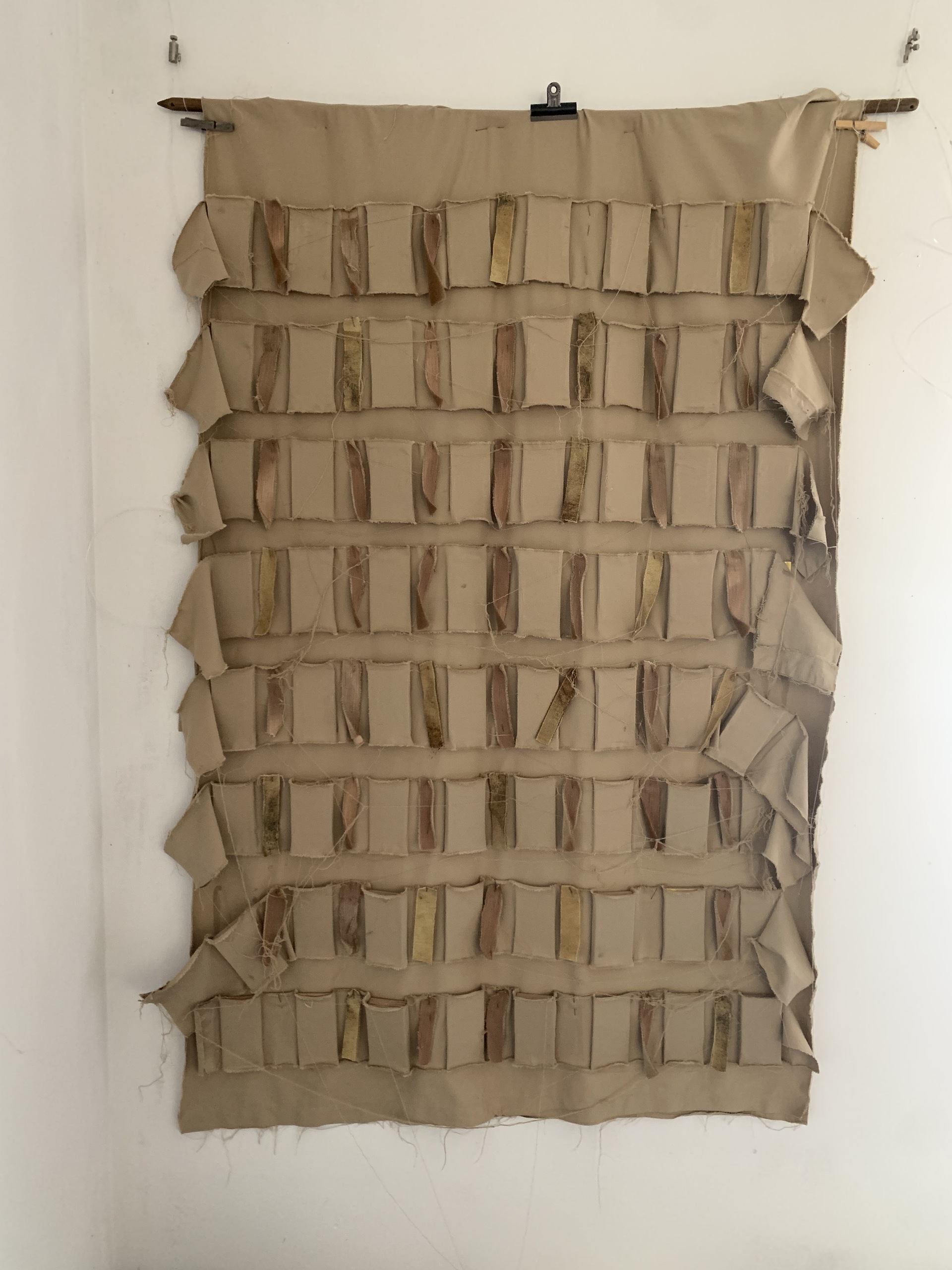 Ik zoek naar structuur door het gebruik van rechthoeken en repen stof, alsof ik het materiaal niet wil beschadigen of pijn doen. Aan de andere kant laat ik de draden zichtbaar en gebruik ik versleten stof om zo toch de herinneringen te bewaren. Dit is een manier om verbonden te blijven en te koesteren van wat was.