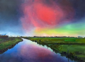 Op 19 januari 2026 was er boven de Weerlanerpolder noorderlicht te zien! Dit werd prachtig vastgelegd door T. Out-Slijkerman. Vervolgens heb ik dit weer geschilderd voor de Weerlanerpolderreeks.