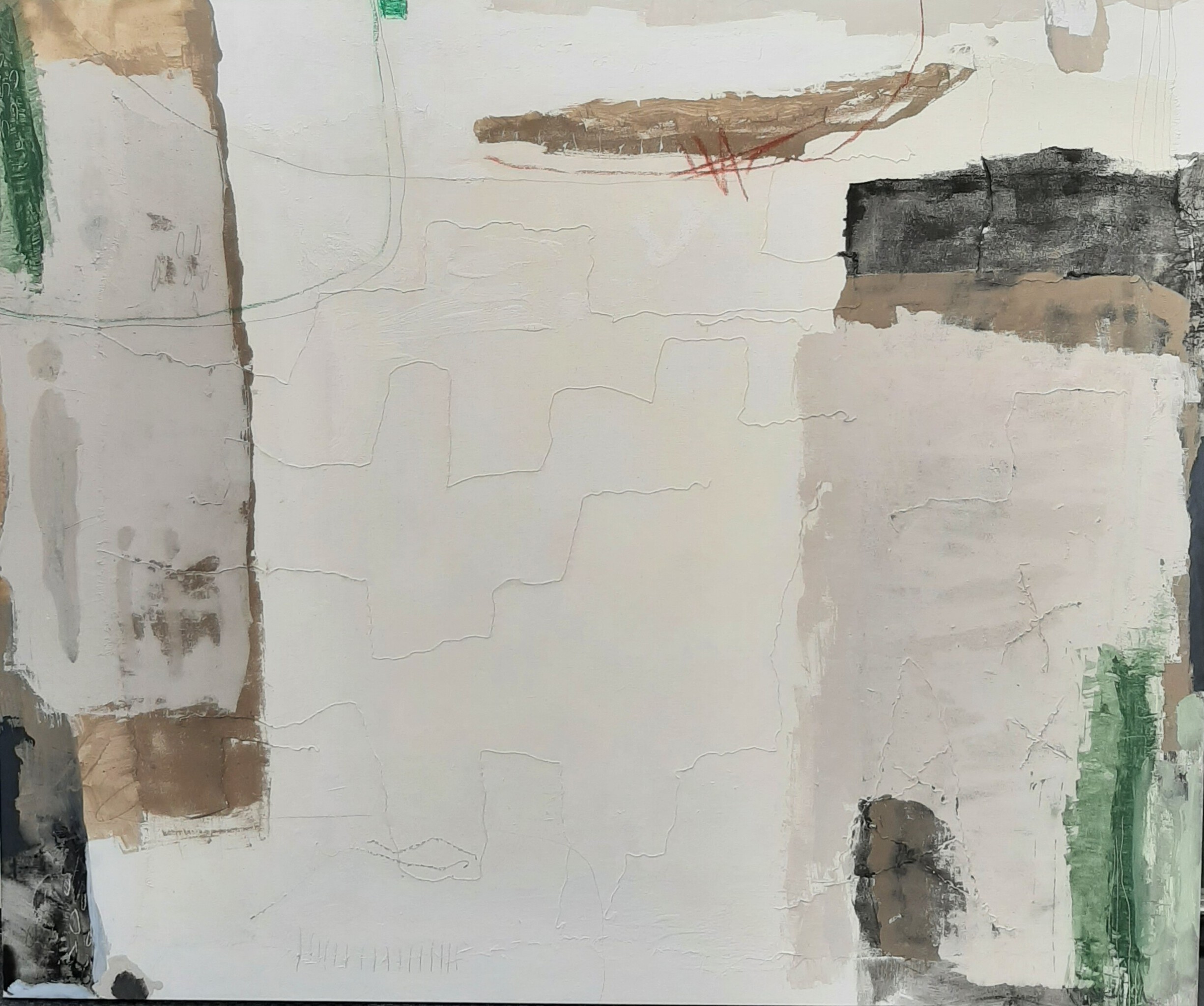 landschappen. Poëtisch maar ook vervreemdend. Met humor en onverwachte wendingen. De kern van de compositie wordt gevormd door grote vormen met een krachtige uitstraling , toegevoegd worden kleine details waardoor je al lopend door het schilderlandschap stuit op onverwachte ontdekkingen.
