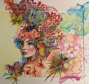 Aquarel geschilderd over passe patou Vrouw - vlinders - bloemen - kolibri
