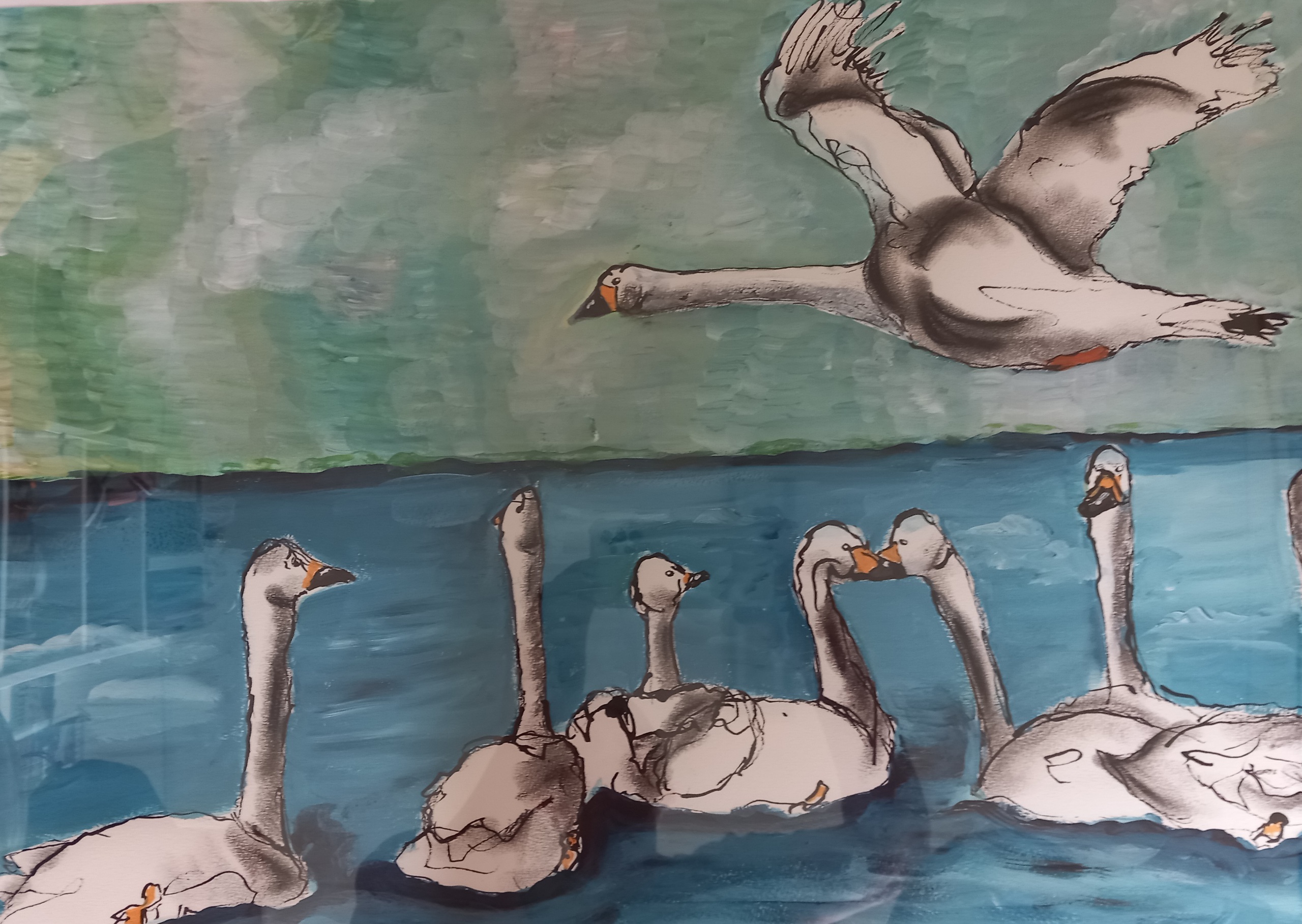 Zwanen Wit Blauw Vogel Meer Oost Indische Inkt Acrylverf Vliegen Zwemmen