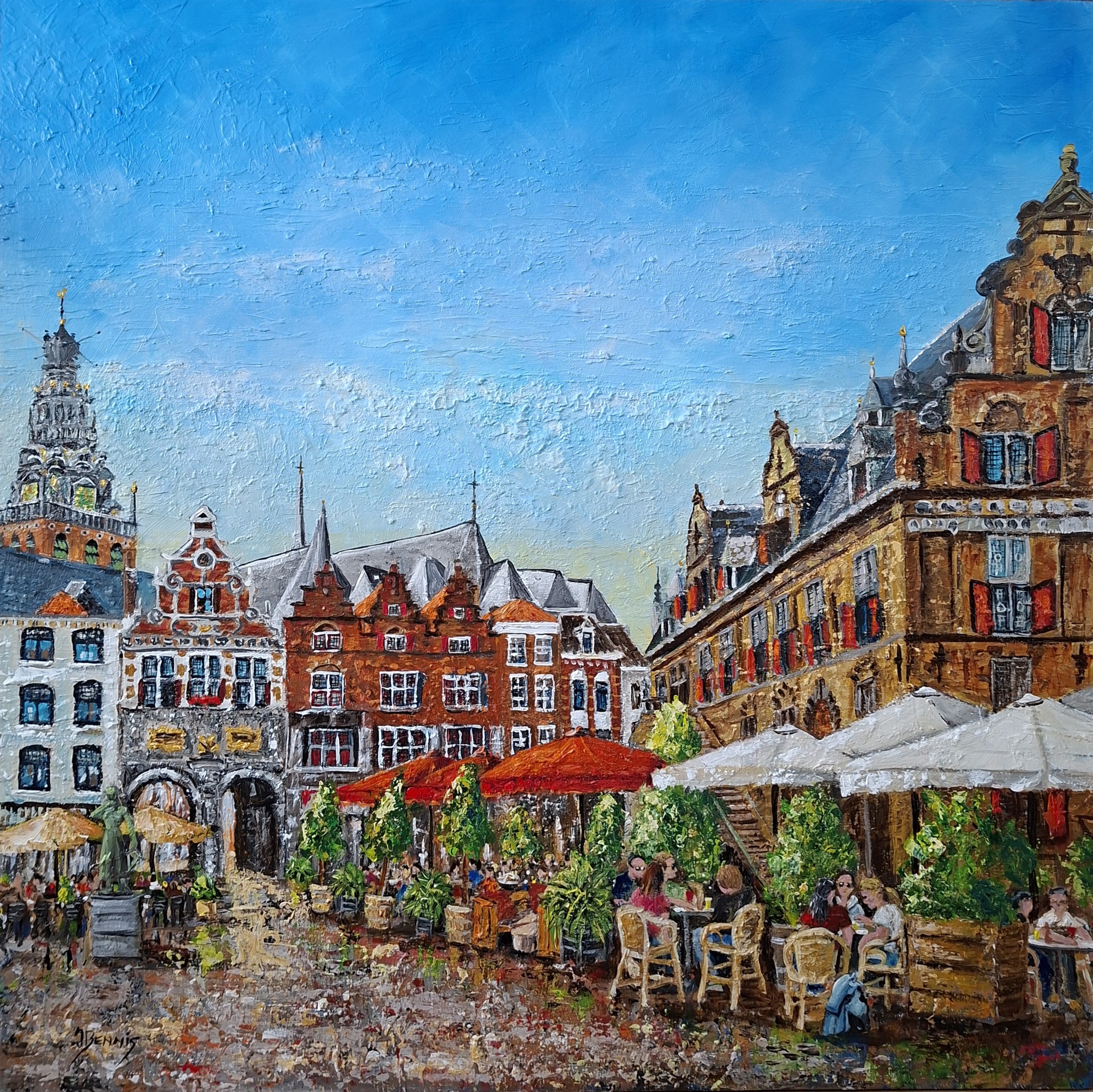 Nijmegen, acryl op plaat 98x98. Met behulp van paletmes in dikke toetsen verf opgezet.