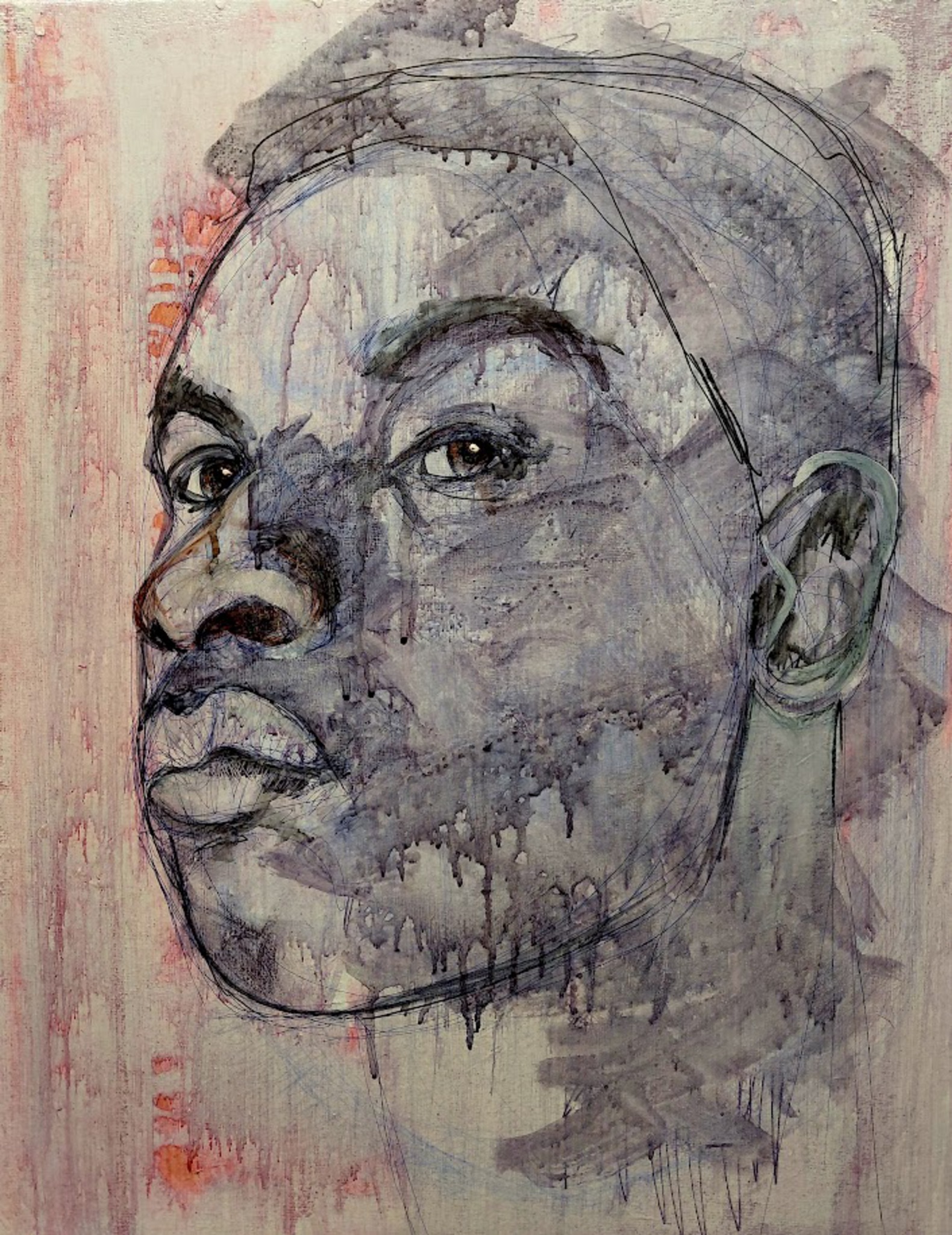 Een indringend portret waarin emotie en gelaagde texturen samenkomen. De vloeiende drips en schetsachtige lijnen vangen kwetsbaarheid, kracht en een stille, naar binnen gerichte blik.