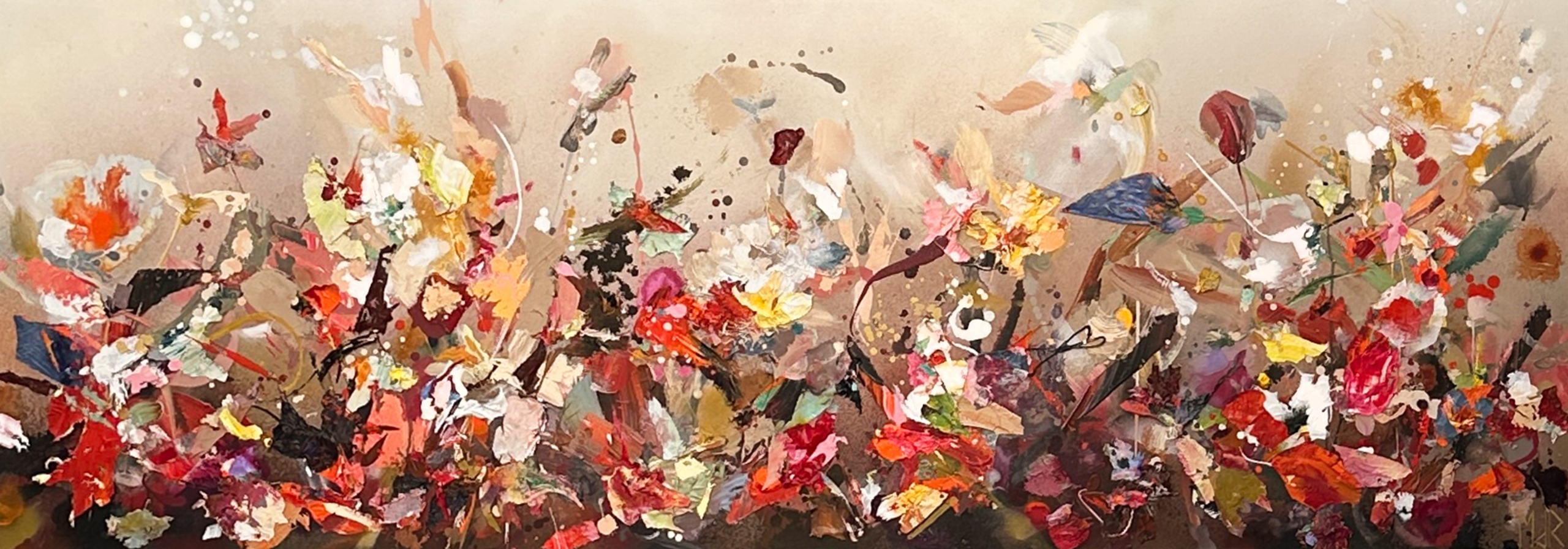 Bloemen Bloemenveld Groot Breed Xl Schilderij Martine De Ruiter Ietsfraais Iets Fraais Paletstukken Natuur Warme Tinten Geel Roze Rood Voorjaar Zomer Zonnig Zon