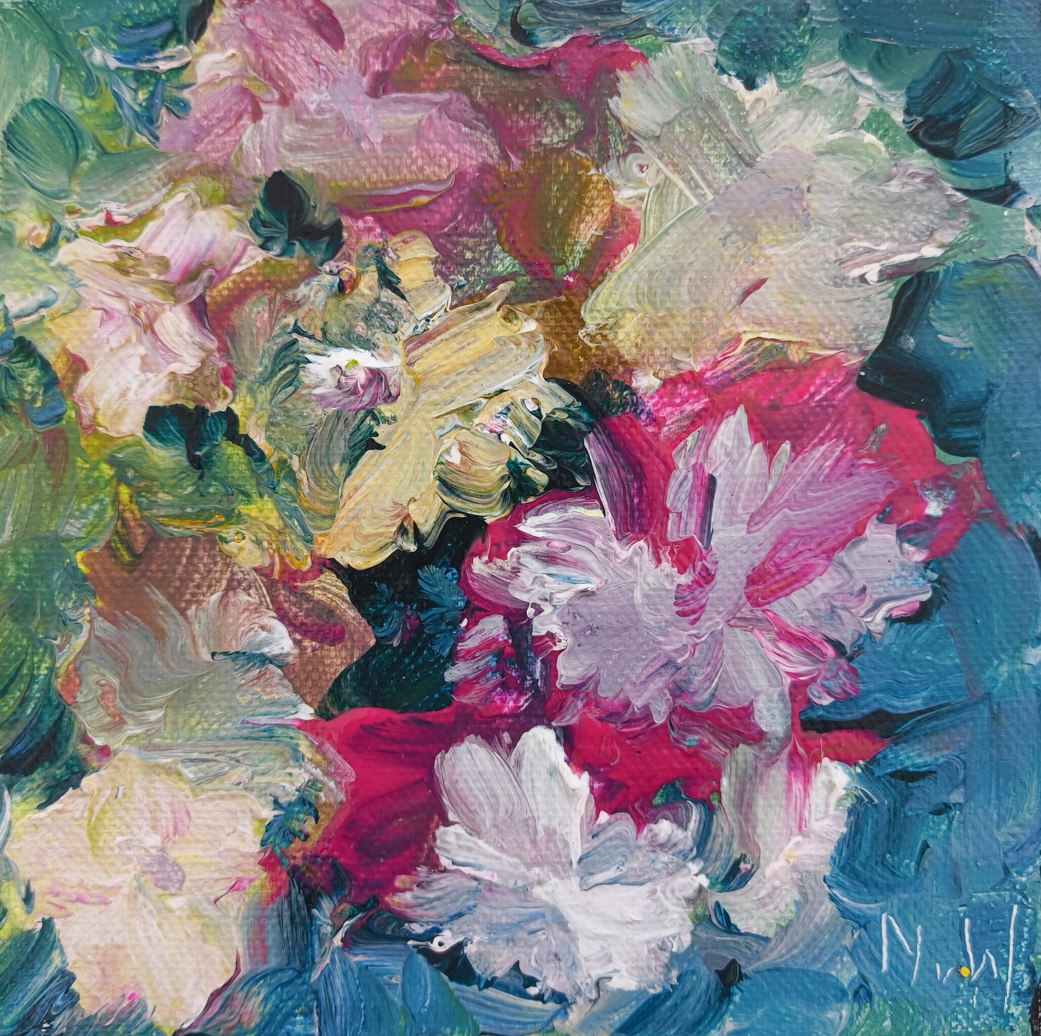 Een klein werk - kleurrijk, spontaan - uiting van de stemming van dat moment. Bloemmotieven geven de ruimte om zonder vooropgezet plan te schilderen. Het geeft vrijheid, die je terugvindt in de uitstraling van dit doekje van 15 x15 cm.