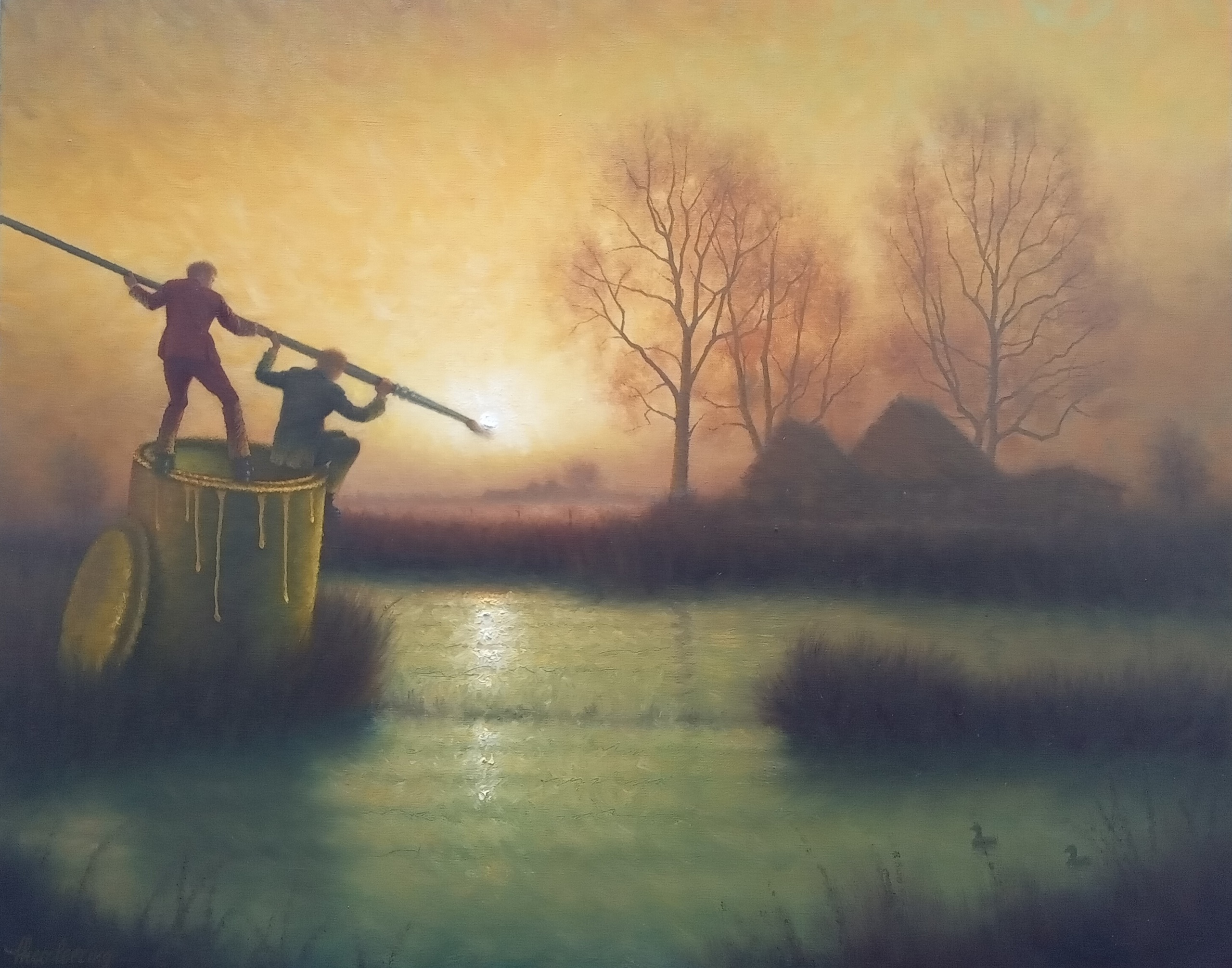 Blik Zonnestralen Landschap Twee Mannen Penseel