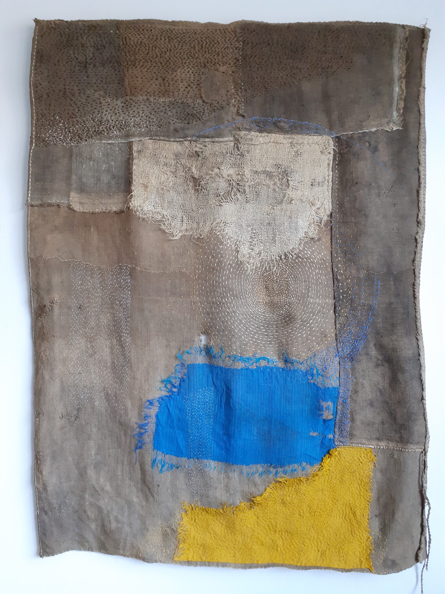 Harvest O - oogsten op een versleten jutezak textielresten aagepoeld uit zee verwerkt op een herstelde jutezak, met borduurzijde, linnen en wollen draden water en de verschillende stadia - het vaste, het vloeibare en het vluchtige, de levensvatbaarheid, alsmede een drager van kennis, met de mogelijkheid tot kunnen groeien en bloeien op een vruchtbare grond