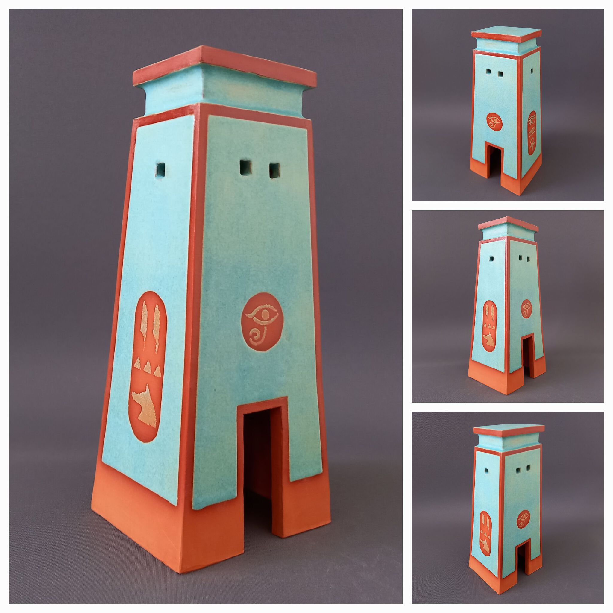 Hyrogliefen Toren. Egyptische entreetoren in rode klei en een mint glazuur.