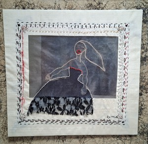 collage van jurkjes, geknipt uit verzamelde stoffen, in houten lijst