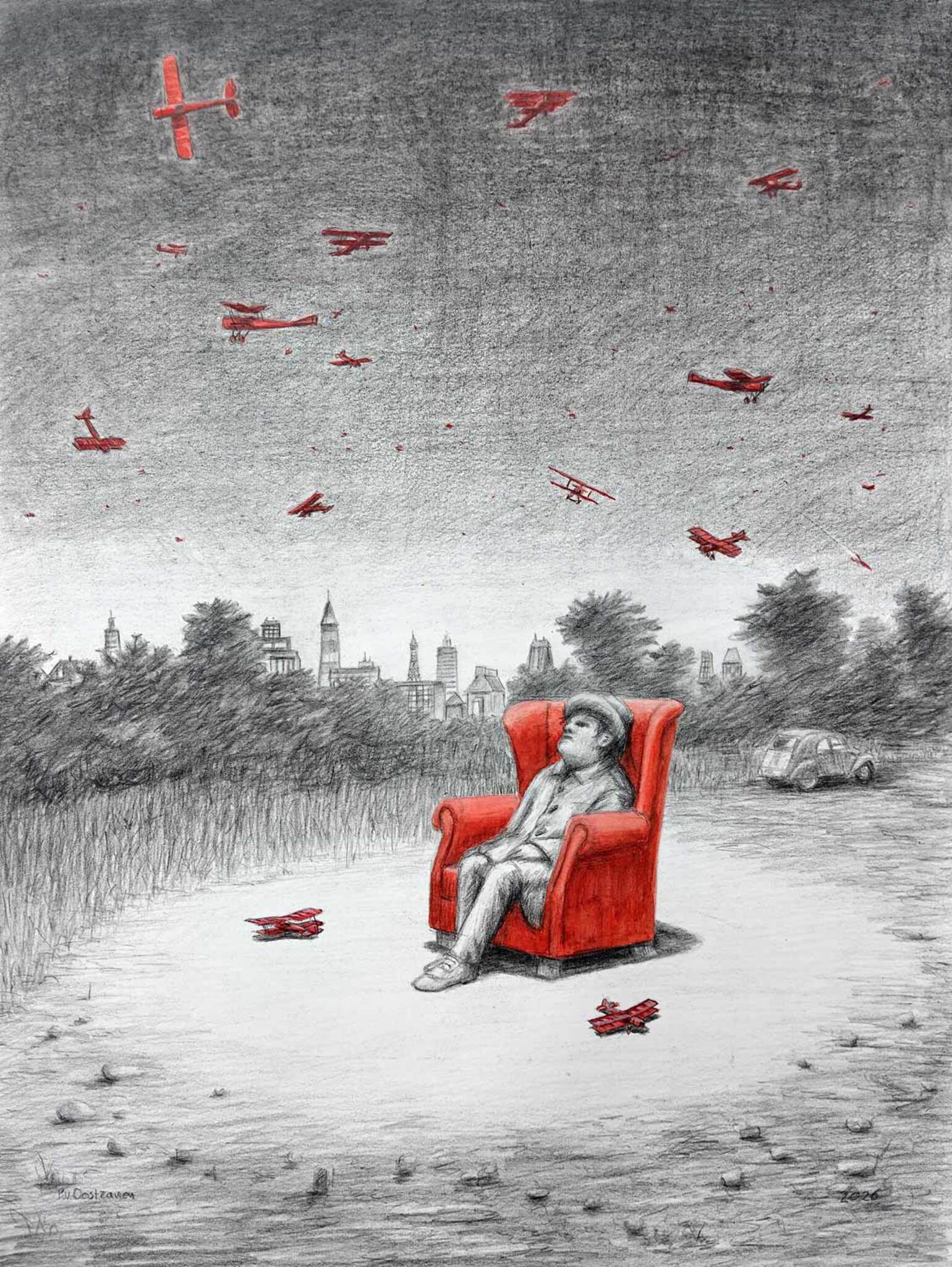 In deze potloodtekening kijkt een eenzame, gehoed figuur vanuit een felrode wingback-fauteuil omhoog naar een donkere, bewolkte lucht. De lucht is gevuld met een dromerige vlucht van talrijke rode tweedekkers en andere vintage vliegtuigen, die sterk afsteken tegen de grauwe omgeving. Aan zijn voeten liggen nog meer rode speelgoedvliegtuigen, terwijl in de verte een vage skyline van een stad en een oude Citroën 2CV te zien zijn, wat de scène een nostalgische en surreële sfeer geeft.