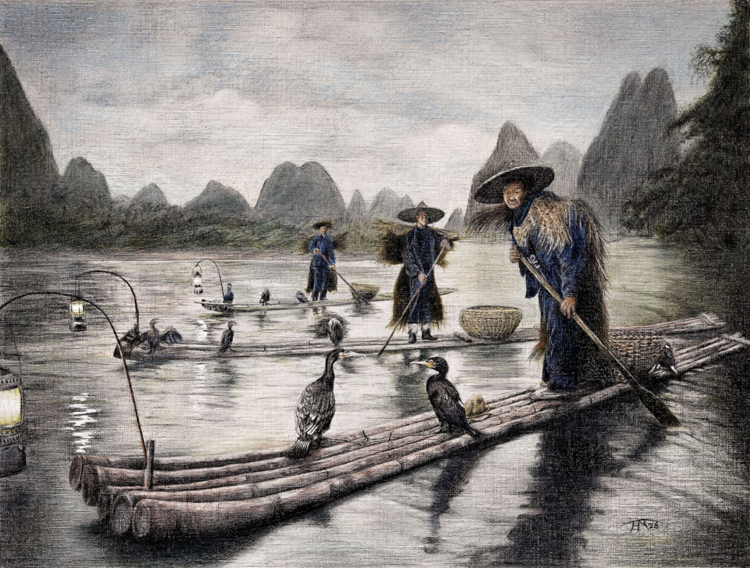 In het Karstgebergte van China wordt op de Li rivier bij Yangshuo volgens eeuwenoude traditie met aalscholvers gevist. De nek wordt dichtgesnoerd en de vogels duiken naar vis. Boven gekomen nemen de vissers de vis af en geven de vogels een kleine beloning. De lampions dienen om de vissen te lokken tegen het vallen van de avond. Carola en ik hebben op de Li rivier gevaren en genoten van dit schitterende berggebied.