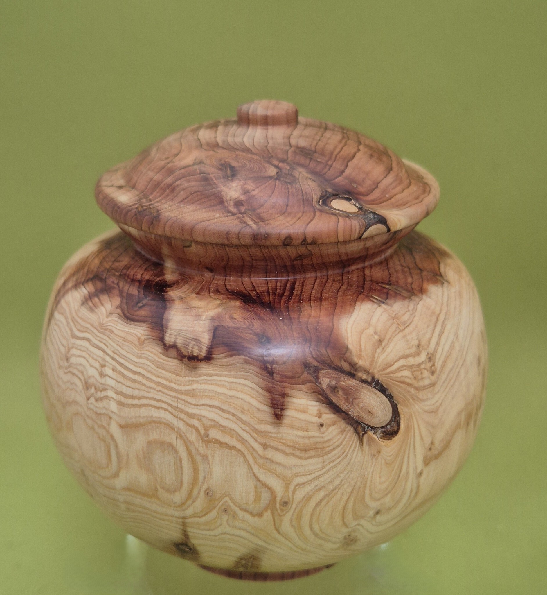 Jeneverbes is een een zeer langzaam groeiende struik die op zanderige grond voorkomt. Hier in Drenthe groeit de struik o.a. bij het Dwingelderveld. Het is een beschermde houtsoort en niet zomaar te koop. Het is keihard en rot niet. Ik kreeg een stammetje uit de tuin van een vriend, wiens jeneverbes was doodgegaan. Het hout ruikt heerlijk, als je er mee aan het werk bent. Tot mijn grote verrassing had, na de schors en de bast weggedraaid te hebben, het hout prachtige rode verkleuringen.