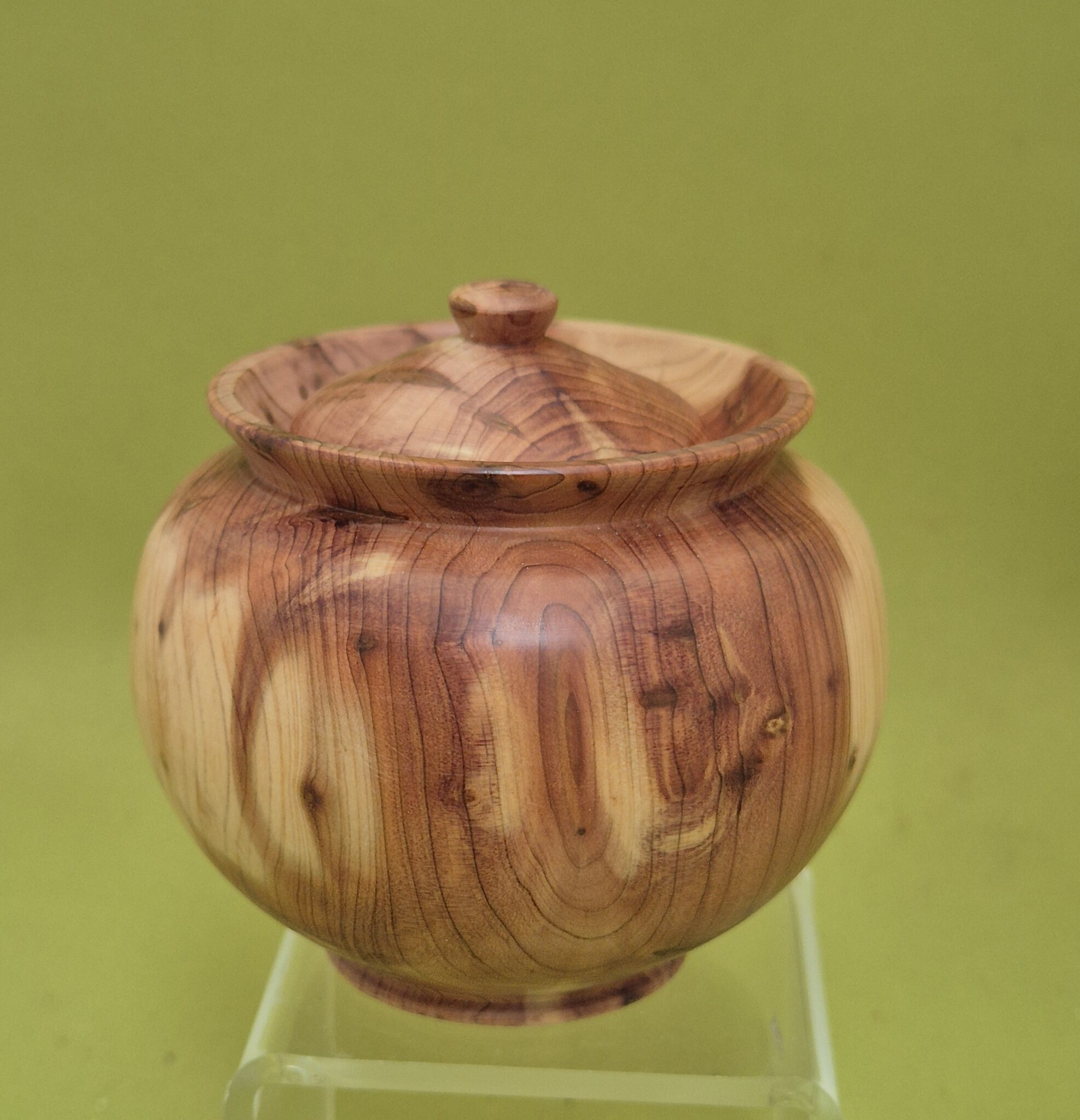 Jeneverbes is een een zeer langzaam groeiende struik die op zanderige grond voorkomt. Hier in Drenthe groeit de struik o.a. bij het Dwingelderveld. Het is een beschermde houtsoort en niet zomaar te koop. Het is keihard en rot niet. Ik kreeg een stammetje uit de tuin van een vriend, wiens jeneverbes was doodgegaan. Het hout ruikt heerlijk, als je er mee aan het werk bent. Tot mijn grote verrassing had, na de schors en de bast weggedraaid te hebben, het hout prachtige rode verkleuringen.