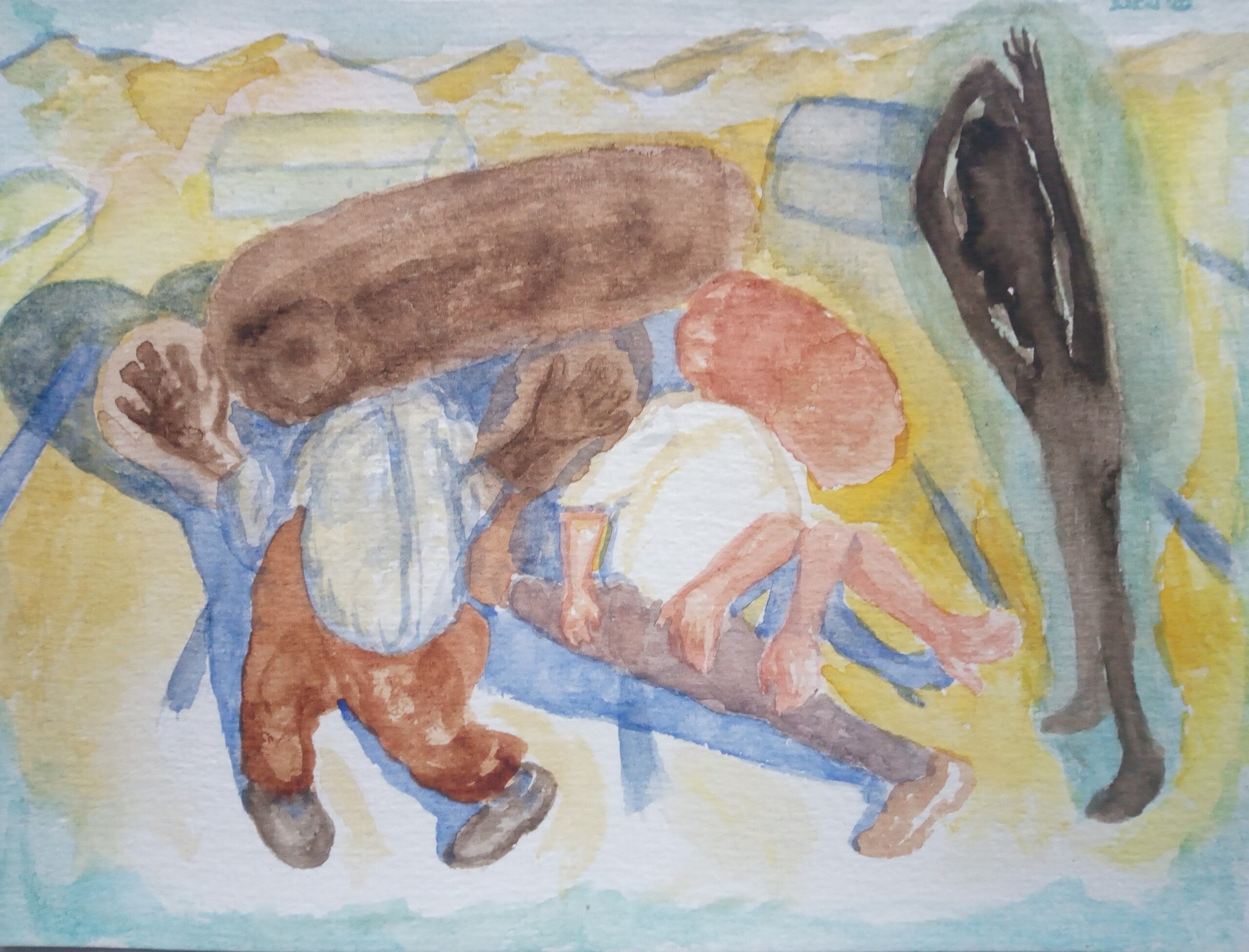 Een landschap met figuren dat rechtstreeks refereert aan een nieuwsfeit. Het feit gaat voornamelijk over het duister waarin iemand met slechte bedoelingen genadeloos zijn machtspositie misbruikt voor eigen gewin. Het gaat voornamelijk over het menselijk vermogen door en door slecht te zijn en daarbij tot de meest gruwelijke misdaden in staat is.
