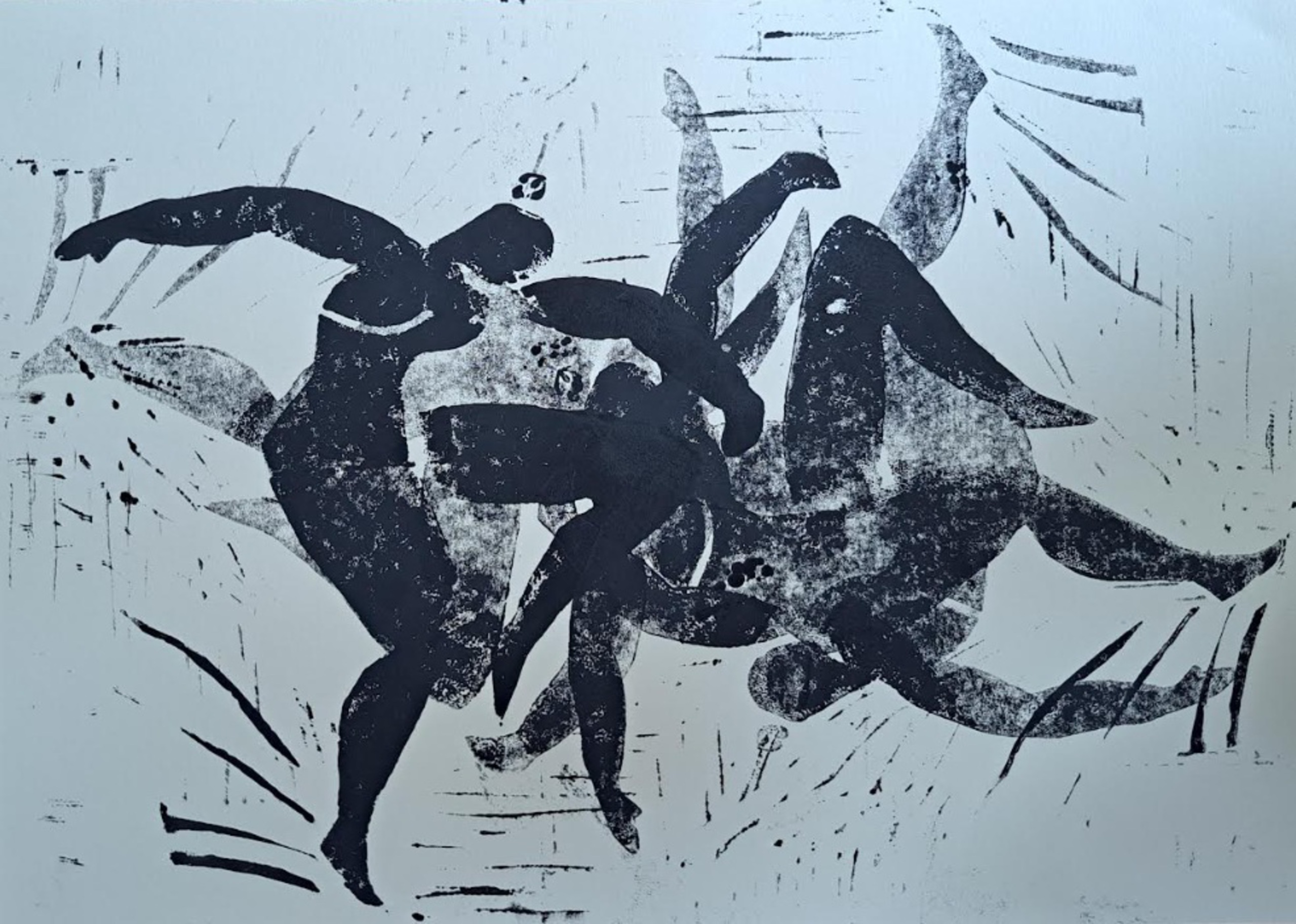 Gekkigheid en gedartel in dit werk. Een linosnede in éénkleurendruk, zwart op ivoorkleurig papier, 270 grams. Afm. 34 x 24 cm.Enkele oplage, dus unicum!