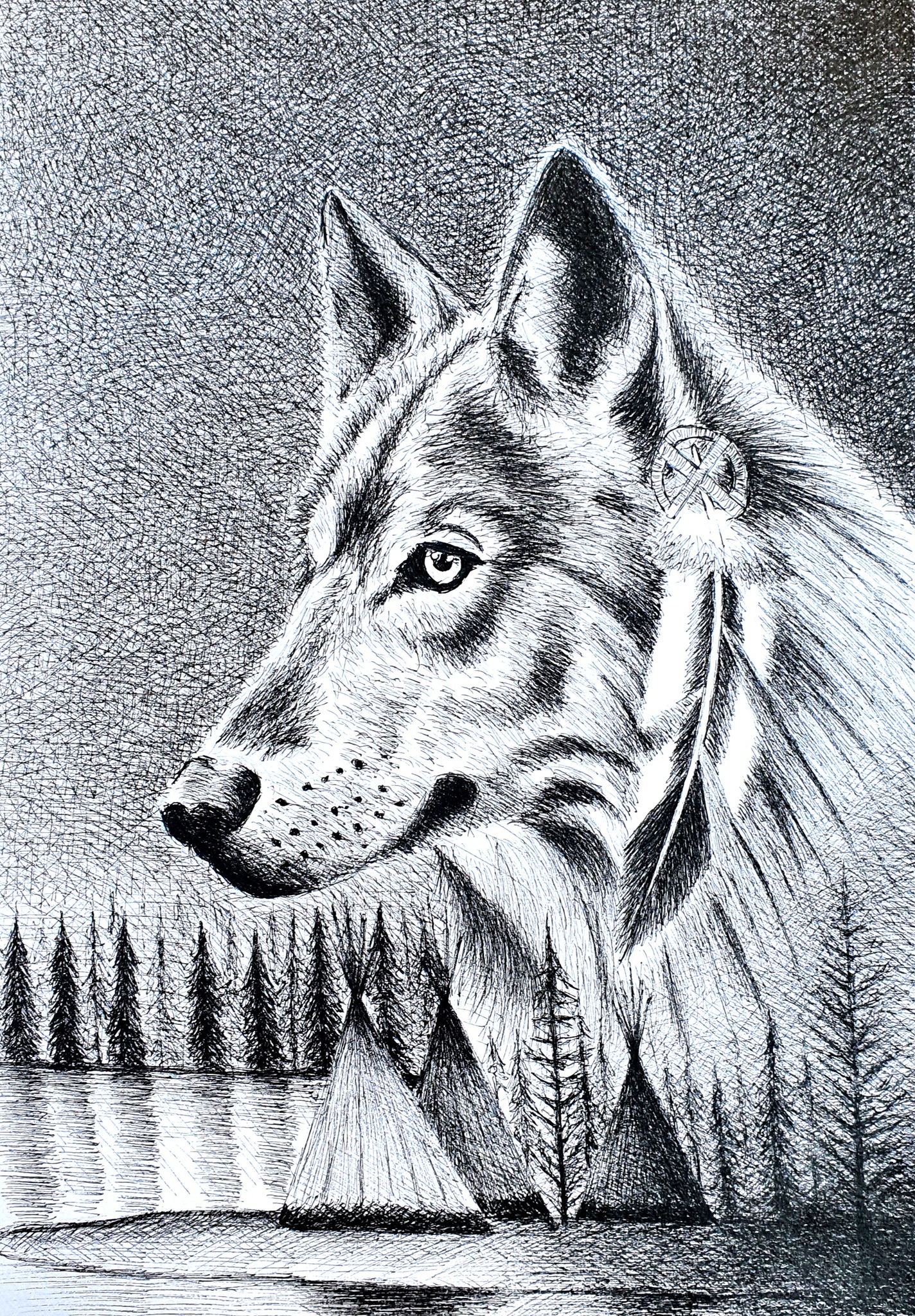 Pentekening die de verbondenheid tussen "The Natives" en "The Wolf" symboliseert.