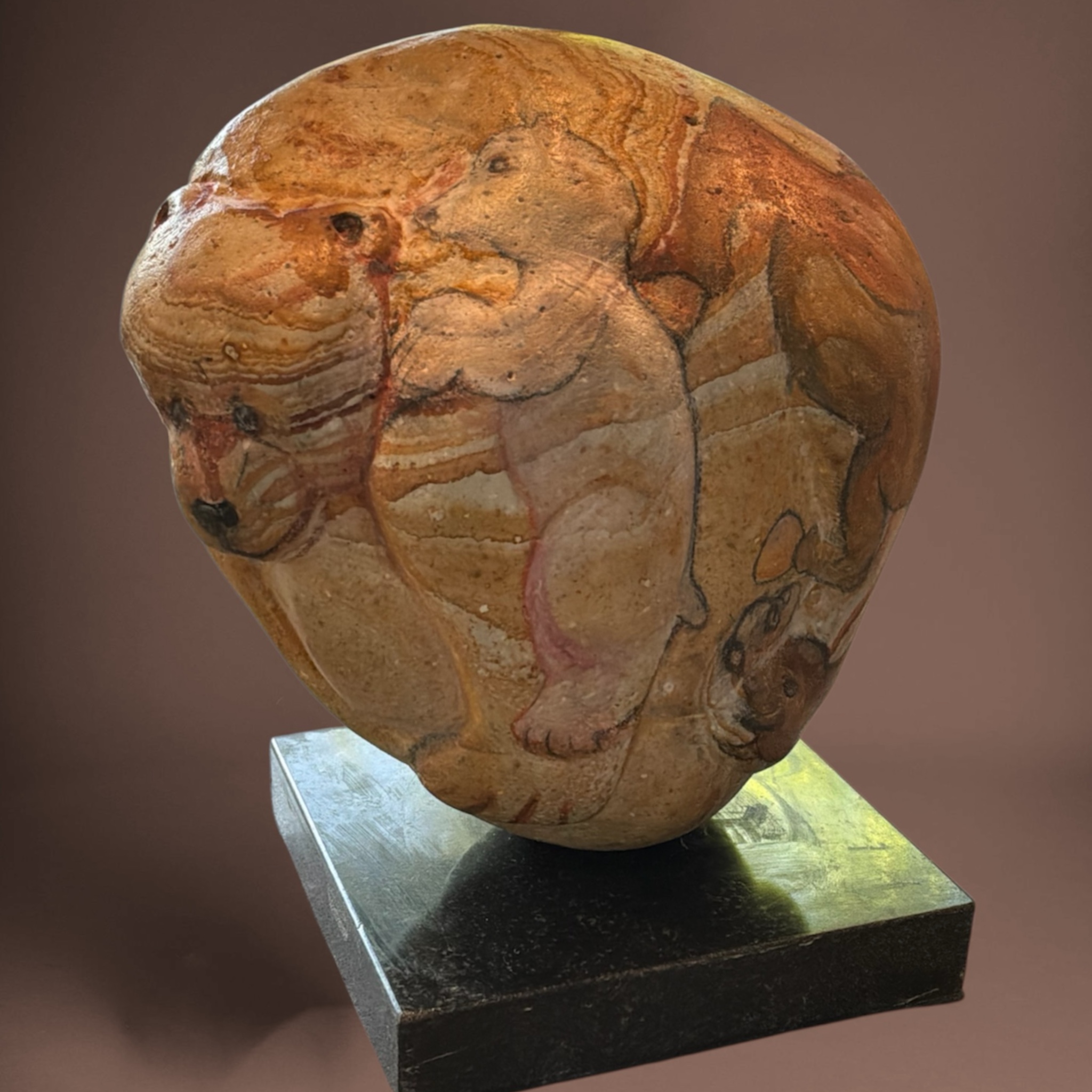 Rainbow sandstone, beschilderd. Een gebeeldhouwde steen, deels beschilderd met tal van dieren. Bij de beschildering is gebruik gemaakt van de vormen lijnen en kleurnuances die de regenboog zandsteen bood.