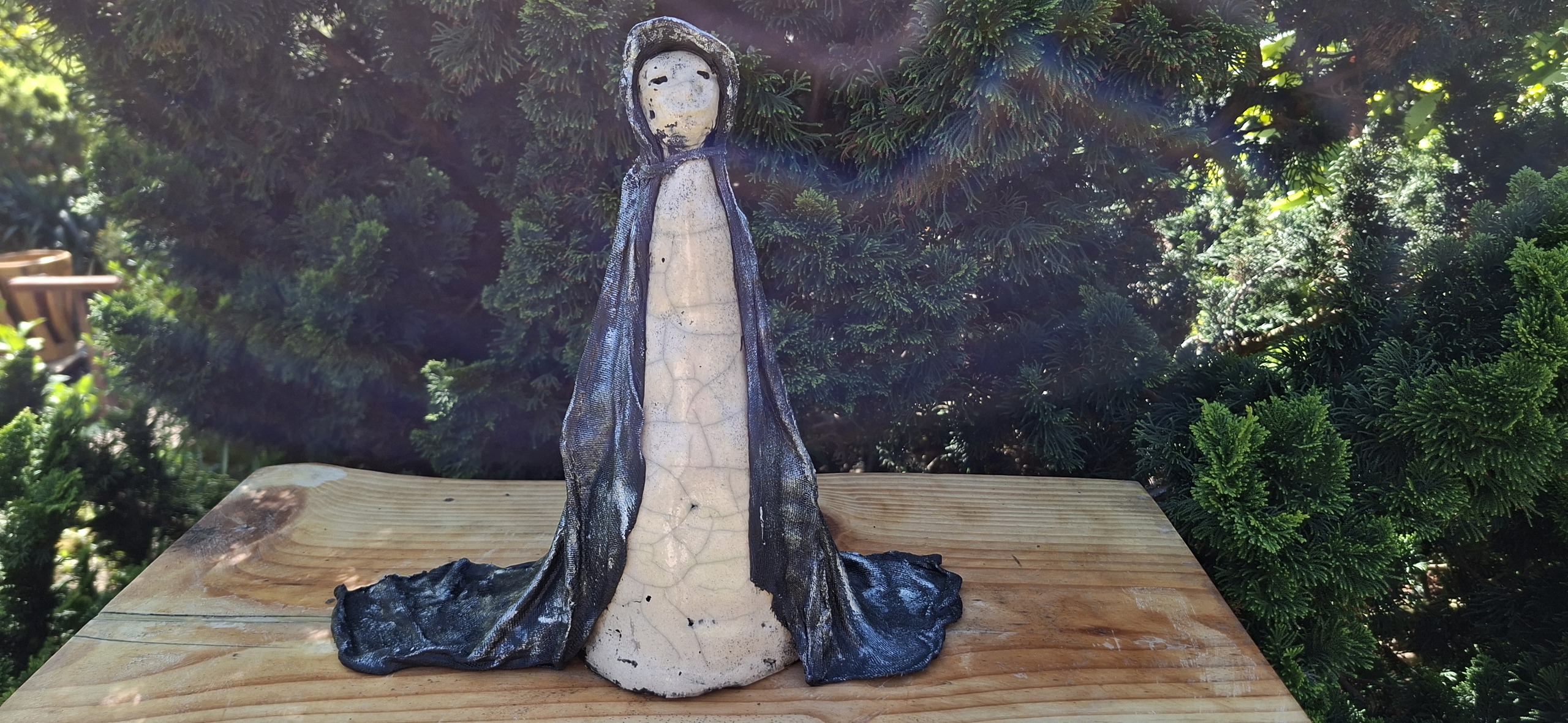 Deze mooie dame is in twee technieken uitgevoerd. Het lijf is raku gestookt,de cape is met textielverharder hard gemaakt.