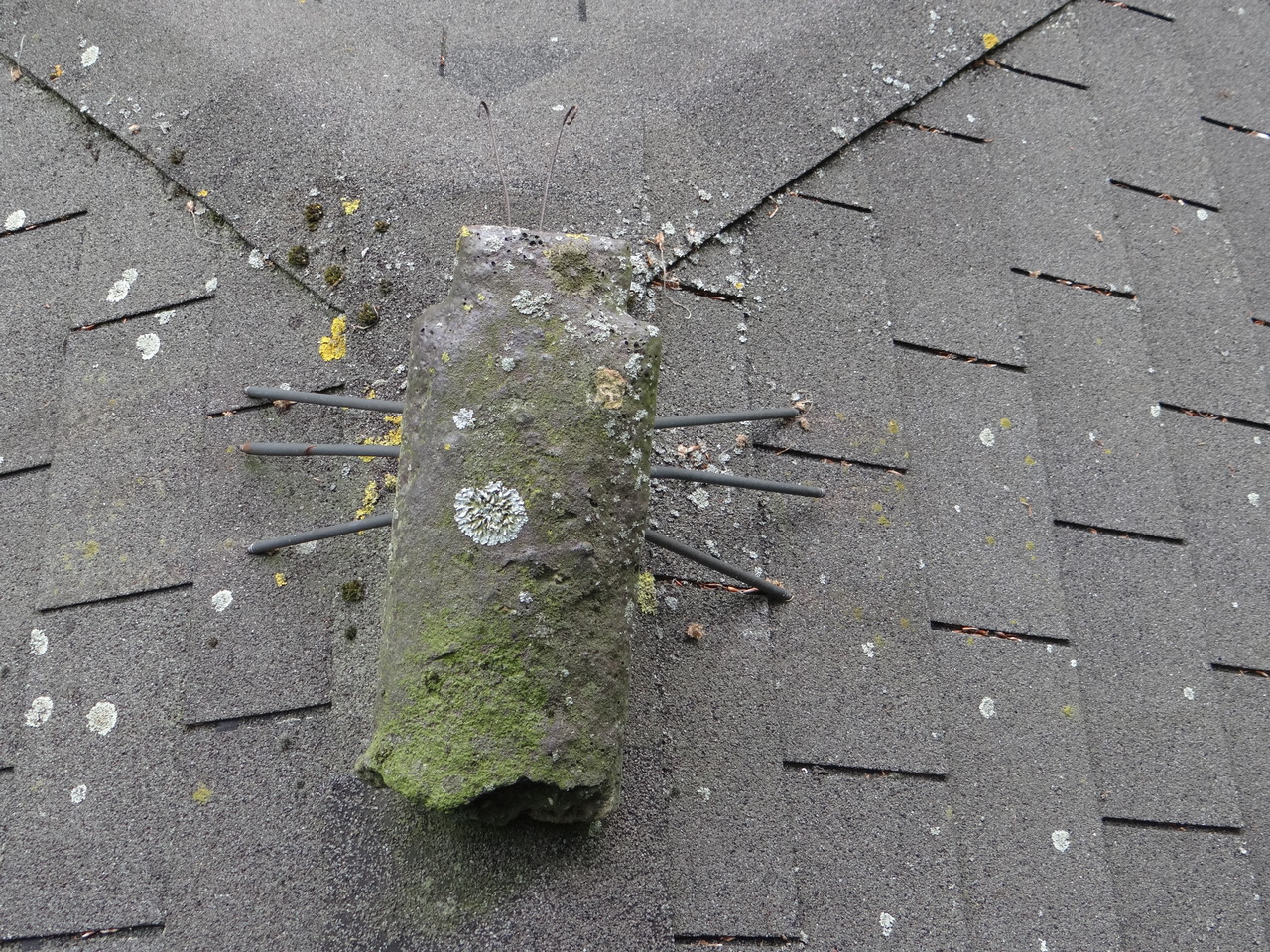 Na een aantal jaren past de tor (nok-steen, rood, met koperen poten en ijzerdraad voelsprieten) zich aan de kleur van het dak aan: kameleon gedrag van levenloos materiaal