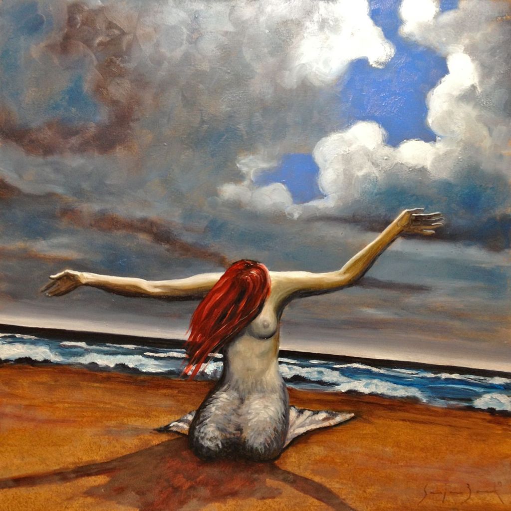 Zee Strand Wolken Vrouw Naakt Olieverf Paneel Wolkenlucht Zeegezicht Masoniet Meermin