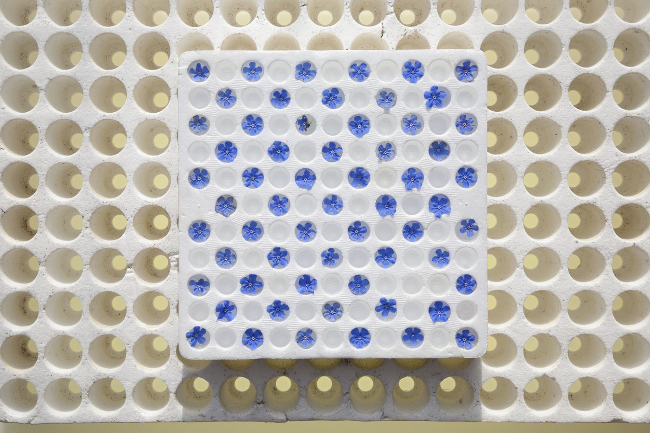 abstract bloemstilleven met vergeetmenietjes in tray