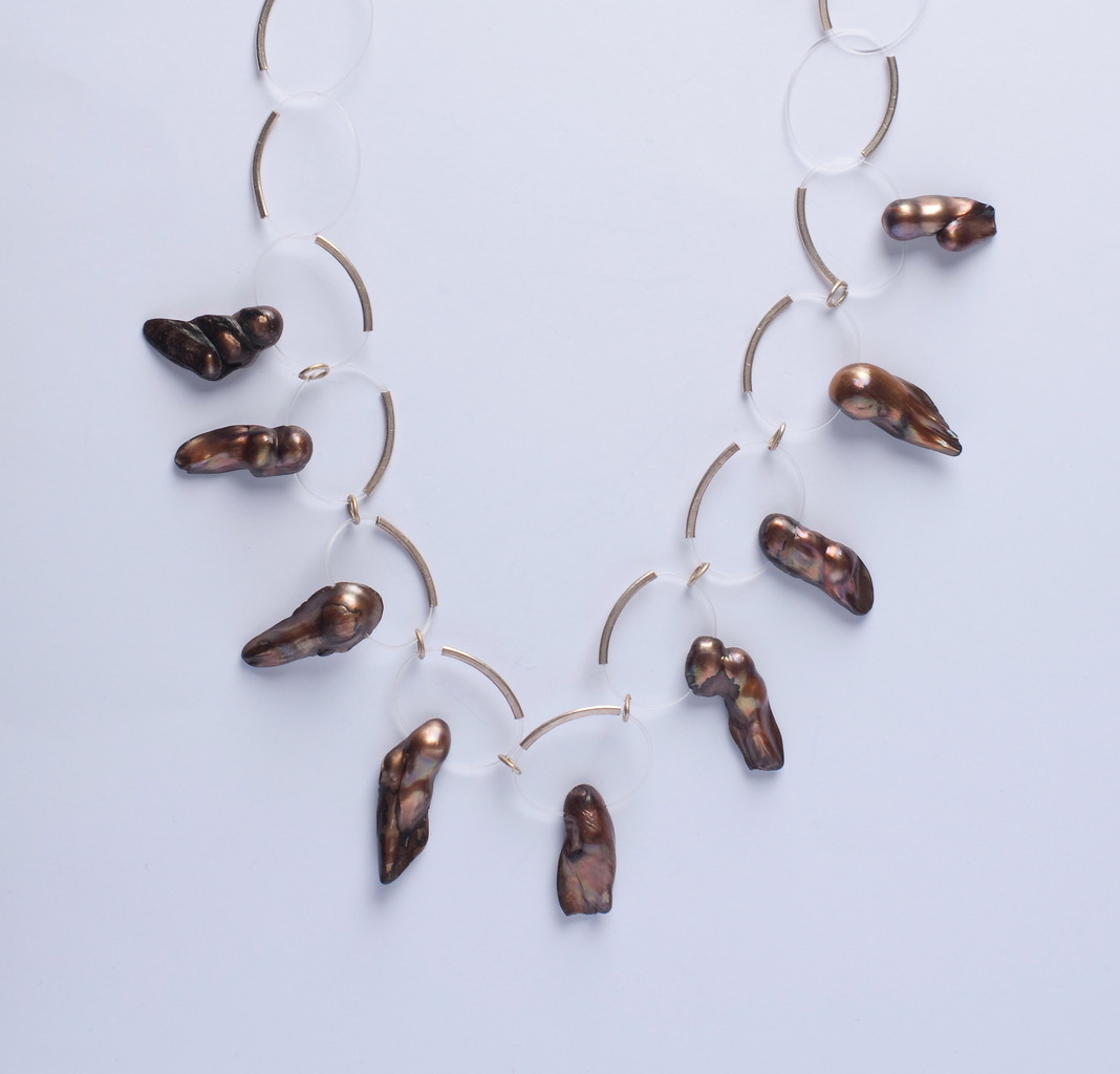Dit collier van biwaparels geregen op schakels van staaldraad en zilver is flexibel en verandert daardoor iets van vorm tijdens het dragen.