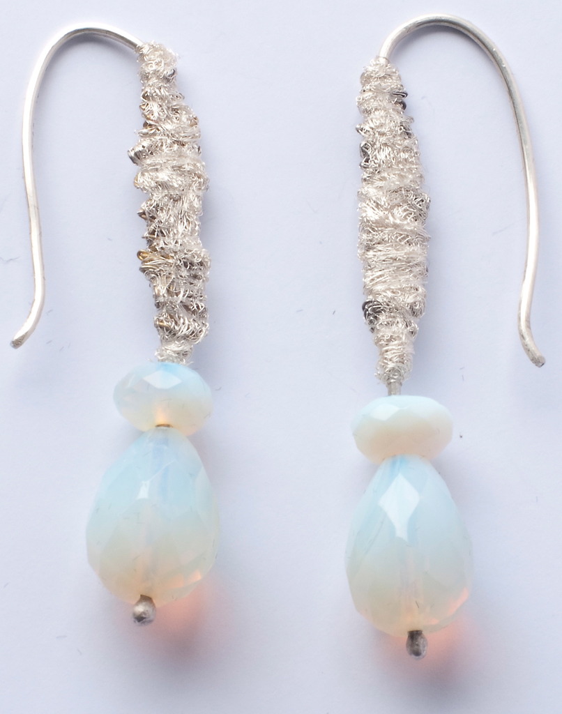 Het opaliet van deze oorbellen neemt het licht op en verandert daardoor van kleur.