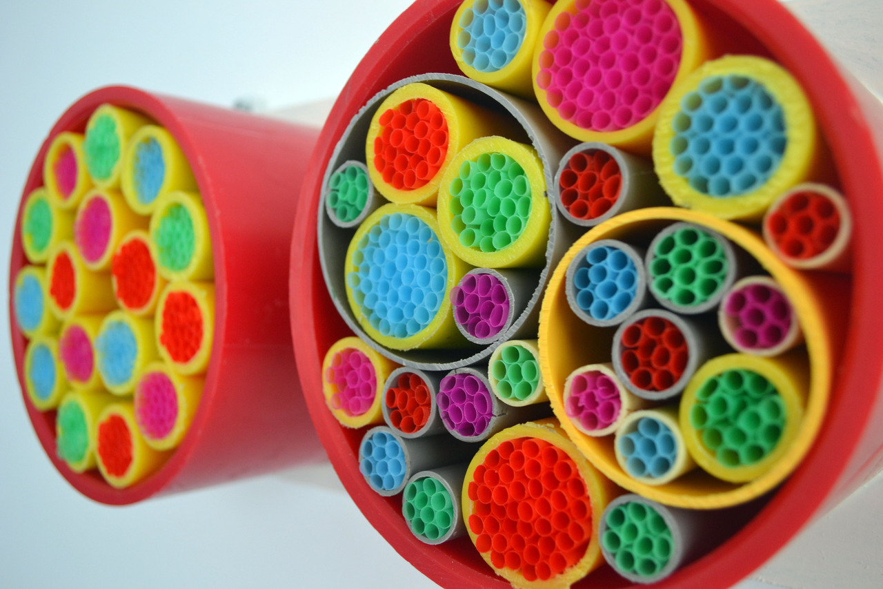 Twee insectenkasten van kunstofbuizen en rietjes.