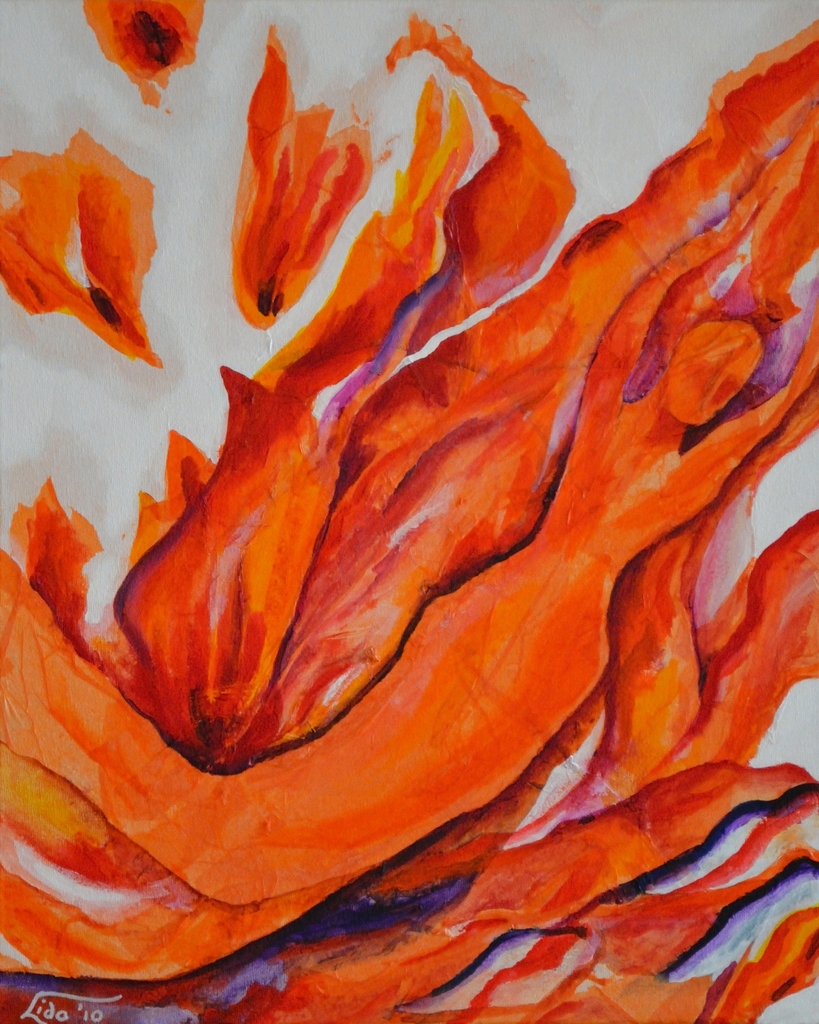 De Grieken geloofden dat de feniks in staat was steeds weer opnieuw uit zijn eigen as herboren te worden. Hij zal dan bovenin een boom van kruiden een nest maken en daarin verbranden. Door de geur van de kruiden zal hij opnieuw geboren worden. In de Chinese cultuur staat het dier voor het vrouwelijke geslacht op de wereld. Hier is abstract een vrouw te zien die als een feniks herboren wordt uit het vuur. Gemaakt door een collage van oranje papier te beschilderen met acrylverf. Als print te koop via http://fineartamerica.com/featured/phoenix-lida-bruinen.html