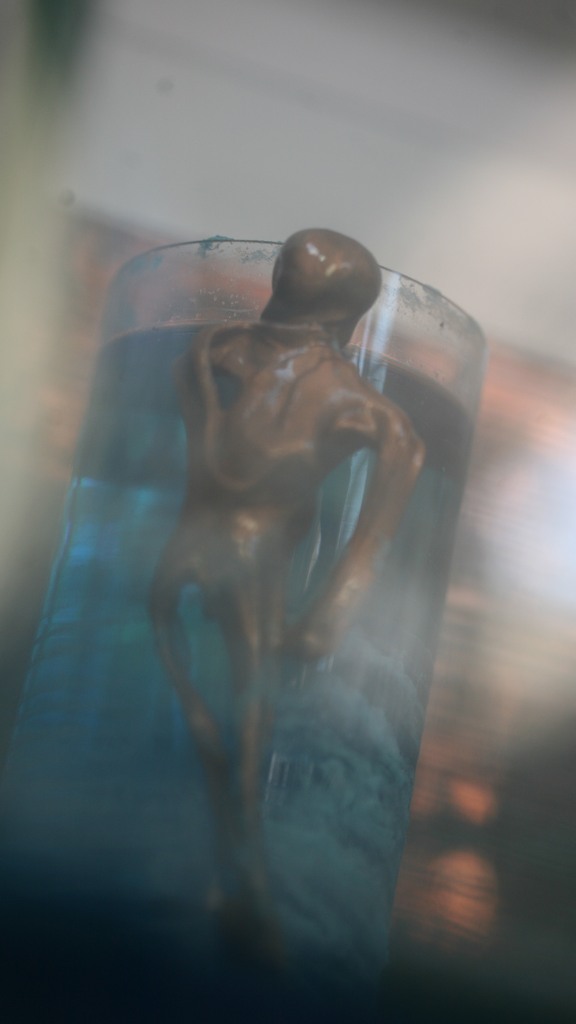 mijn foto’s zijn analoog gemaakt, een vastlegging van licht dat er net als de schimmige figuren maar heel even was. Dezelfde thematiek is te zien op de koperplaten. Deze zijn extreem lang geëtst, waardoor openingen, oxides en structuren ontstaan die het beeld bepalen. De op deze manier imperfecte, want aangetaste mensfiguren vertellen hun verhaal door hun houding en plaats in de ruimte. Tegelijk is duidelijk te zien dat de afbeelding vóór het etsen anders, misschien wel compleet was.